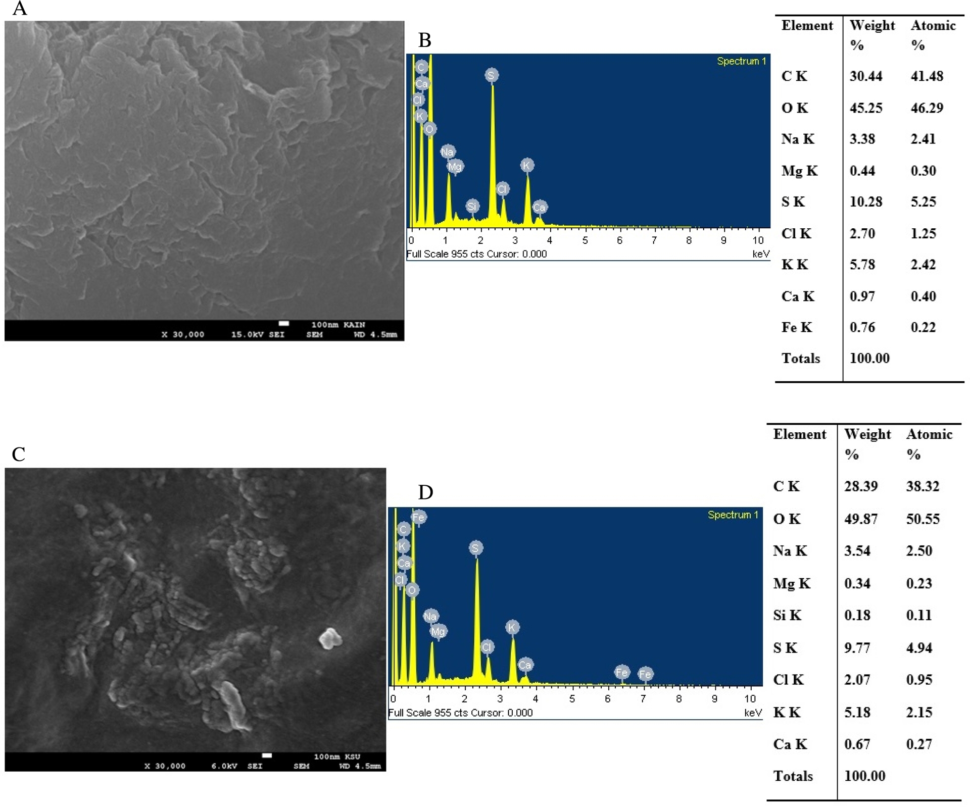 BioC film: (A) SEM image, (B) EDS patterns and a tabulation of the EDS spectrum; bioC–GO nanocomposites: (C) SEM image, (D) EDS patterns and a tabulation of the EDS spectrum.