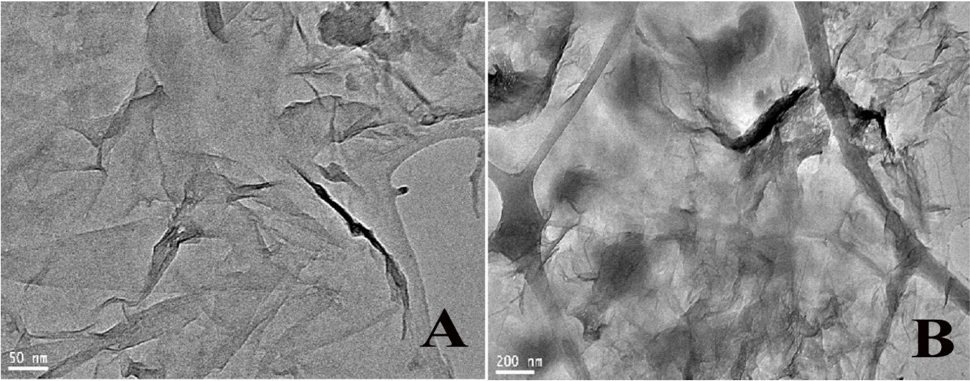 Transmission electron microscopy (TEM) was used to assess the bioC–GO nanocomposite ink’s morphology as shown in Figures 4A and B. Imaging using TEM revealed the presence of nanocomposite flakes with one or more layers. Although GO is primarily clear, its surface frequently exhibits brightness changes due to elastic corrugations and scrolled or folded edges [25]. The TEM images revealed bioC–GO sheets that were extensively wrinkled, highlighting their distinct structural characteristics. After careful TEM investigation, it was determined that our samples’ diameters fall within the nanometer range, highlighting their nanostructured nature [26]. Additionally, the samples’ high level of disorder highlights how dynamic and complicated the bioC–GO nanocomposites are. Consequently, the other components in the composite help widen the interlayer gap between the GO sheets, preventing them from reassembling [27, 28].