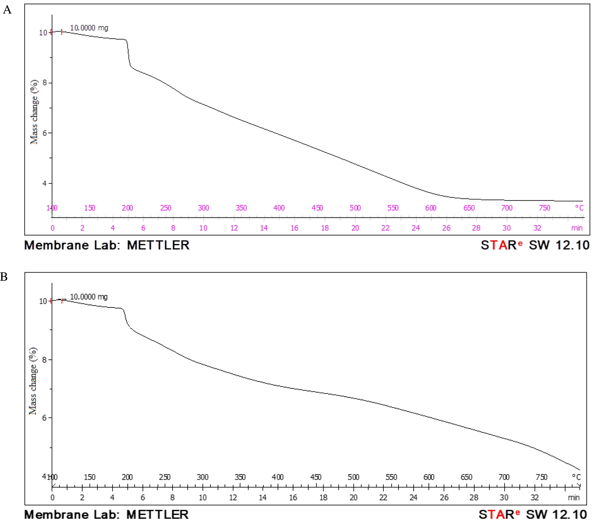 A thorough TGA of the bioC–GO nanocomposites was conducted in a nitrogen environment at a heating rate of 50 °C. The bioC and bioC–GO nanocomposites were heated at a rate of 20 °C per minute from 100 °C to 800 °C. The TGA data displayed in Figures 5A and B provide a wealth of information on the thermal characteristics of the bioC and nanocomposites [29].