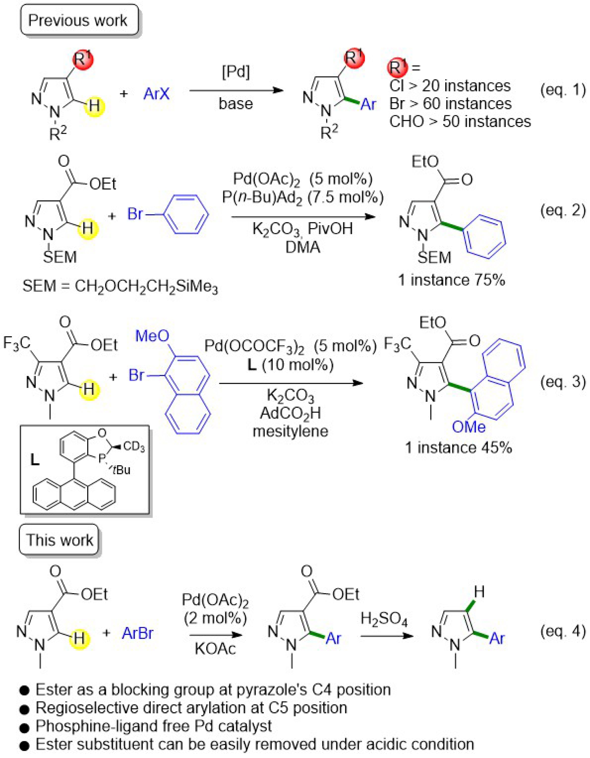 Direct C–H bond functionalization of (hetero)arenes by palladium catalysis is an important research topic in organic chemistry [4, 5, 6, 7, 8, 9, 10, 11, 12, 13, 14, 15, 16, 17, 18], and a number of methods for controlling the regioselectivity of such a C–H bond functionalization have been reported over the past few decades. Palladium-catalyzed C–H bond arylation of five-membered ring heteroarenes has emerged as an increasingly reliable method for one-step access to (poly)arylated heteroarenes. This method constitutes a promising alternative to existing methods, particularly the Stille, the Suzuki, or the Negishi coupling reactions [19]. The palladium-catalyzed C–H bond arylation approach exhibits a notable advantage as it circumvents the need for preliminary synthesis of organometallic derivatives. In the case of five-membered ring heteroarenes, the positions that exhibit the greatest reactivity in Pd-catalyzed C–H bond activation are generally C2 and C5, as evidenced by studies involving furan, thiophene, and pyrrole rings [20]. However, this approach is not without limitations when it comes to certain substrates, as the regioselectivity of the coupling process can be sometimes challenging to control [20]. The pyrazole scaffold has been identified as one of the most challenging substrates, as demonstrated in the seminal study by Sames and colleagues [21]. They reported that the reaction of 1-SEM-pyrazole (SEM = 2-(trimethylsilyl)ethoxymethyl) with bromobenzene resulted in the formation of 5-phenylpyrazole, 4-phenylpyrazole, and 4,5-diphenylpyrazole in a 4:1:3 ratio. As a result, due to the presence of the C4 and C5 free positions in a significant number of pyrazoles, several groups obtained mixtures of arylated products [22, 23, 24, 25, 26]. At present, the most reliable method for controlling the regioselectivity of Pd-catalyzed pyrazoles arylation at the C5 position is the introduction of a formyl [27, 28], chloro [29, 30], or bromo [31, 32] blocking group at the C4 position of the pyrazole (Scheme 1, Equation (1)). The introduction of an ester substituent as a blocking group has the potential to be a highly practical approach, primarily due to the ease with which it can be removed following arylation and also due to its considerable potential in organic synthesis. However, the use of such ester substituents on pyrazoles as a blocking groups remains limited. Sames and coworkers described a single example of the C5-arylation of ethyl 1-SEM-pyrazole-4-carboxylate with bromobenzene as coupling partner using Pd(OAc)2 (5 mol%) associated to expensive and air-sensitive ligand P(nBu)Ad2 (7.5 mol%) as the catalytic system (Scheme 1, Equation (2)) (for a study on the regioselectivity of the Pd-catalyzed CH arylation of pyrazoles [21]). Very recently, an enantioselective palladium-catalyzed C–H arylation of ethyl 1-methyl-3-(trifluoromethyl)pyrazole-4-carboxylate was reported, using Pd(OCOCF3)2 associated to a sophisticated phosphine ligand as the catalyst (Scheme 1, Equation (3)) [27]. The objective of the present study was to provide more robust evidence for the potential of an ester substituent as a blocking group at the C4 position of pyrazoles in Pd-catalyzed direct arylation. To achieve this objective, our study focused on the reactivity of ethyl 1-methylpyrazole-4-carboxylate (Scheme 1, Equation (4)). Herein we describe: (1) the conditions for the Pd-catalyzed regioselective C–H C5-arylation of ethyl 1-methylpyrazole-4-carboxylate without decarboxylation; (2) the spectrum of aryl bromides in this process; and (3) the conditions for the decarboxylation of a prepared 5-arylpyrazole derivative.