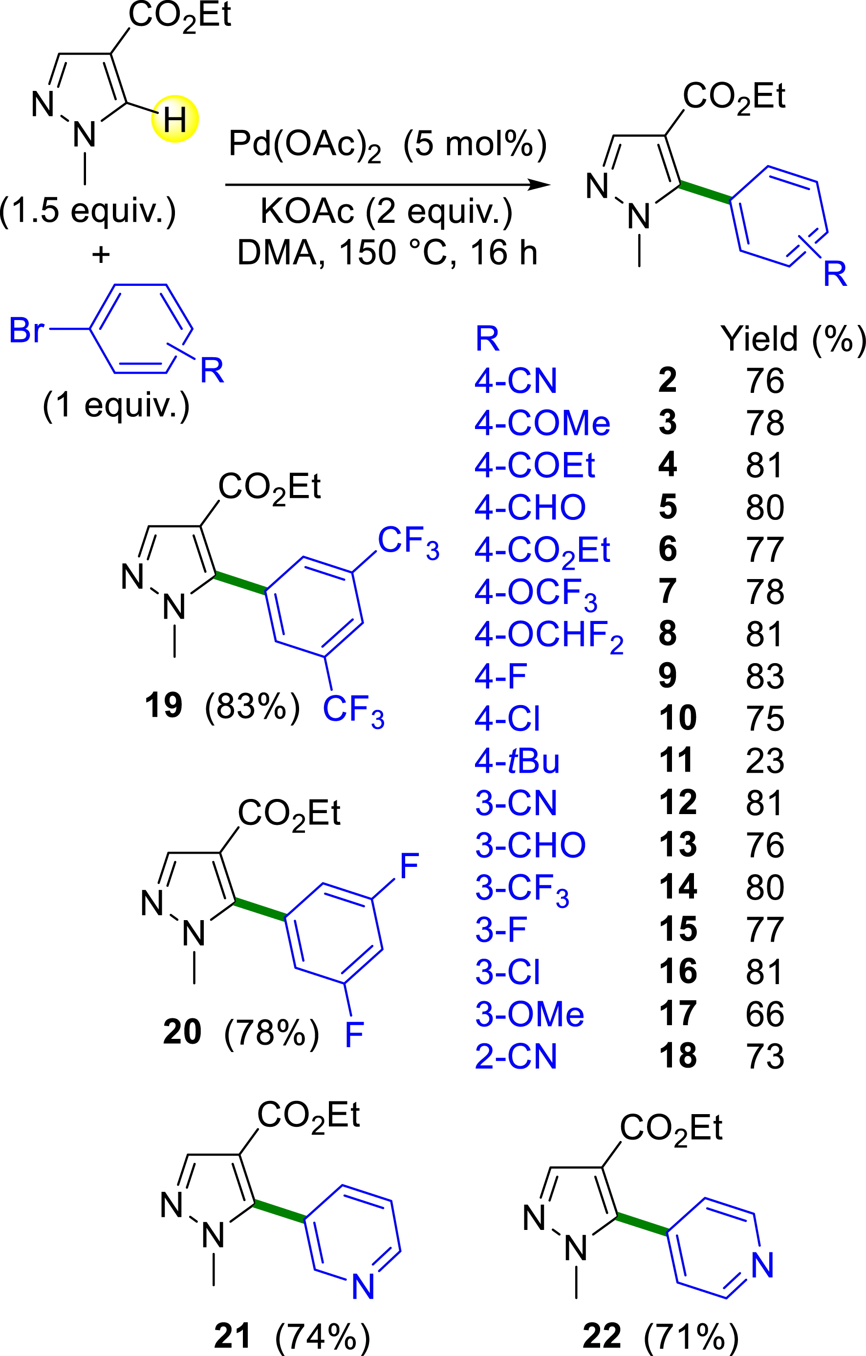 Ethyl 1-methylpyrazole-4-carboxylate was then subjected to a series of Pd-catalyzed direct arylation reactions with a variety of ortho-, meta-, and para-substituted aryl bromides (Scheme 2). The reactions were carried out using the phosphine-free Pd(OAc)2 catalyst (2 mol%), in the presence of KOAc as an inexpensive base, in DMA at 150 °C. Electron-deficient aryl bromides substituted at the para position with nitrile, acetyl, propionyl, formyl, ester, or trifluoromethoxy groups were selected as the reactant for the synthesis of C5-arylated pyrazoles. All these electron-deficient aryl bromides afforded the target compounds 2–8 in yields ranging from 76 to 81%. The presence of a fluorine substituent at the para position of the aryl bromide, which does not exert a significant electronic influence, resulted in a yield of product 9 comparable to that observed in the previous experiments. By using 4-bromo-1-chlorobenzene, the desired product 10 was obtained in 75% yield. It is noteworthy that the C–Cl bond remained intact during the course of this reaction, thereby enabling subsequent transformations. It is also worth noting that the electron-rich 4-tert-butylbromobenzene afforded 11 in a low yield of 23%, which is due to the low conversion of the aryl bromide. From the electron-deficient nitrile, formyl and trifluoromethyl meta-substituted aryl bromides, the C5-arylated pyrazoles 12–14 were obtained in good yields. In a similar manner, 3-fluorobromobenzene and 3-bromo-1-chlorobenzene were converted into the target products 15 and 16 in 77% and 81% yield, respectively. In addition, when less activated 3-bromoanisole was used as the starting material, the target product 17 was produced in 66% yield. The reactivity of the ortho-substituted 2-bromobenzonitrile was also investigated. Again, the reaction was successful, and compound 18 was obtained in 73% yield. The disubstituted 1,3-bis(trifluoromethyl)-5-bromobenzene and 1-bromo-3,5-difluorobenzene also afforded the expected products 19 and 20 in good yields. In addition, the N-containing heteroaromatics 3- and 4-bromopyridines were found to be effective reagents in the synthesis of the desired heteroarylated pyrazoles 21 and 22, with isolated yields of 74 and 71%, respectively. Therefore, a comparison of our method with previous ones employing an ester blocking group [21, 27] (Scheme 1, b and c), reveals several advantages: our procedure is phosphine-free, a cost-effective base is employed, and several functional groups at the para, meta, and ortho positions of the aryl bromide are tolerated.