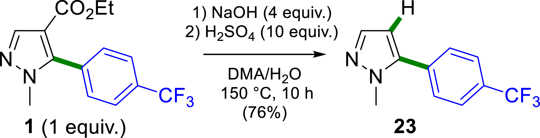 The decarboxylation of pyrazole-4-carboxylates has previously been described by several research groups [37, 38, 39]. In order to further demonstrate the effectiveness of using an ester substituent as a removable blocking group on pyrazoles, the decarboxylation of ethyl 1-methyl-5-(4-(trifluoromethyl)phenyl)pyrazole-4-carboxylate 1 was achieved (Scheme 3). Under basic conditions followed by acidification, in DMA at 150 °C, a complete decarboxylation was observed, resulting in the formation of the desired 1-methyl-5-(4-(trifluoromethyl)phenyl)pyrazole 23 in 76% yield.