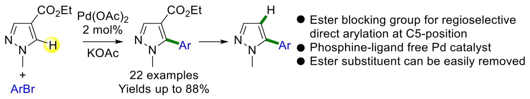 In summary, the results of this study show that an ester function is an effective and easily removable blocking group at the C4 position of a pyrazole, which enables a regioselective arylation at the C5 position. The reaction exhibits high tolerance to a wide array of functional groups, at the para, meta, and even ortho positions of the aryl bromides. It should be noted that the ester function remained unaltered by the reaction conditions. The utility of ester substituents in a variety of organic reactions, as well as their easy elimination has been well-documented. Therefore, using such blocking groups on pyrazoles is an attractive approach. Furthermore, the use of only 2 mol% of an air-stable phosphine-free palladium catalyst in conjunction with KOAc as an inexpensive base renders this one-step process highly appealing for the synthesis of 5-arylpyrazole derivatives.