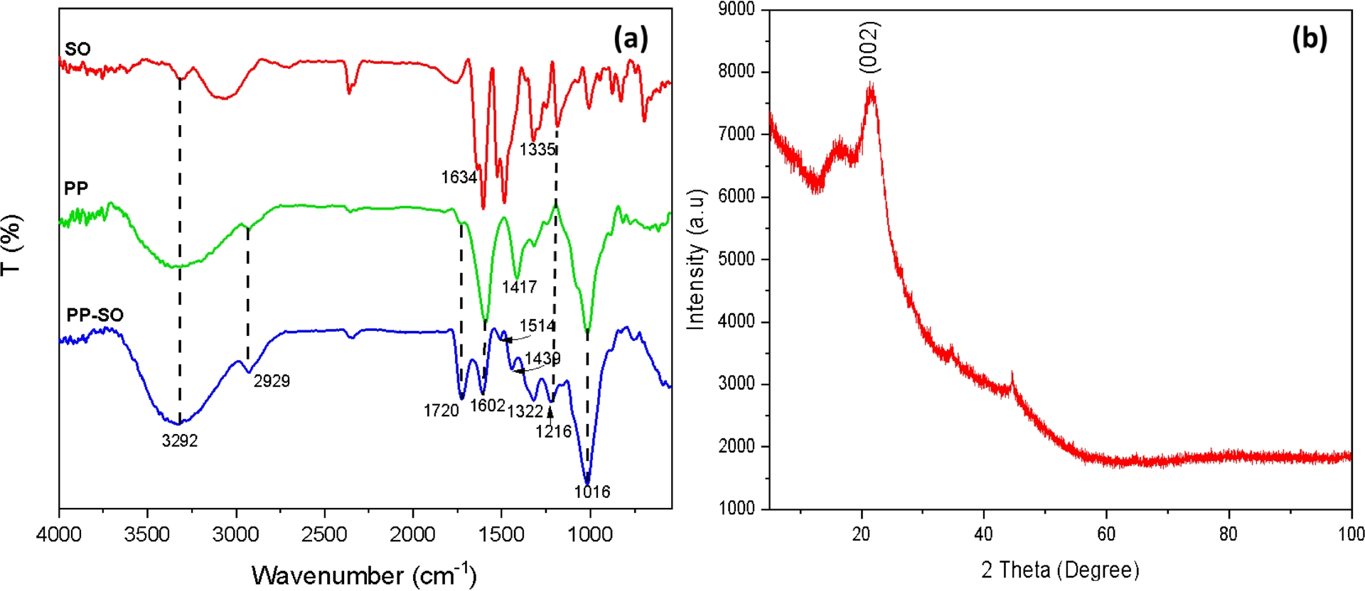 (a) FTIR spectrum of the SO dye, PP before adsorption and PP after adsorption of the dye; (b) XRD.