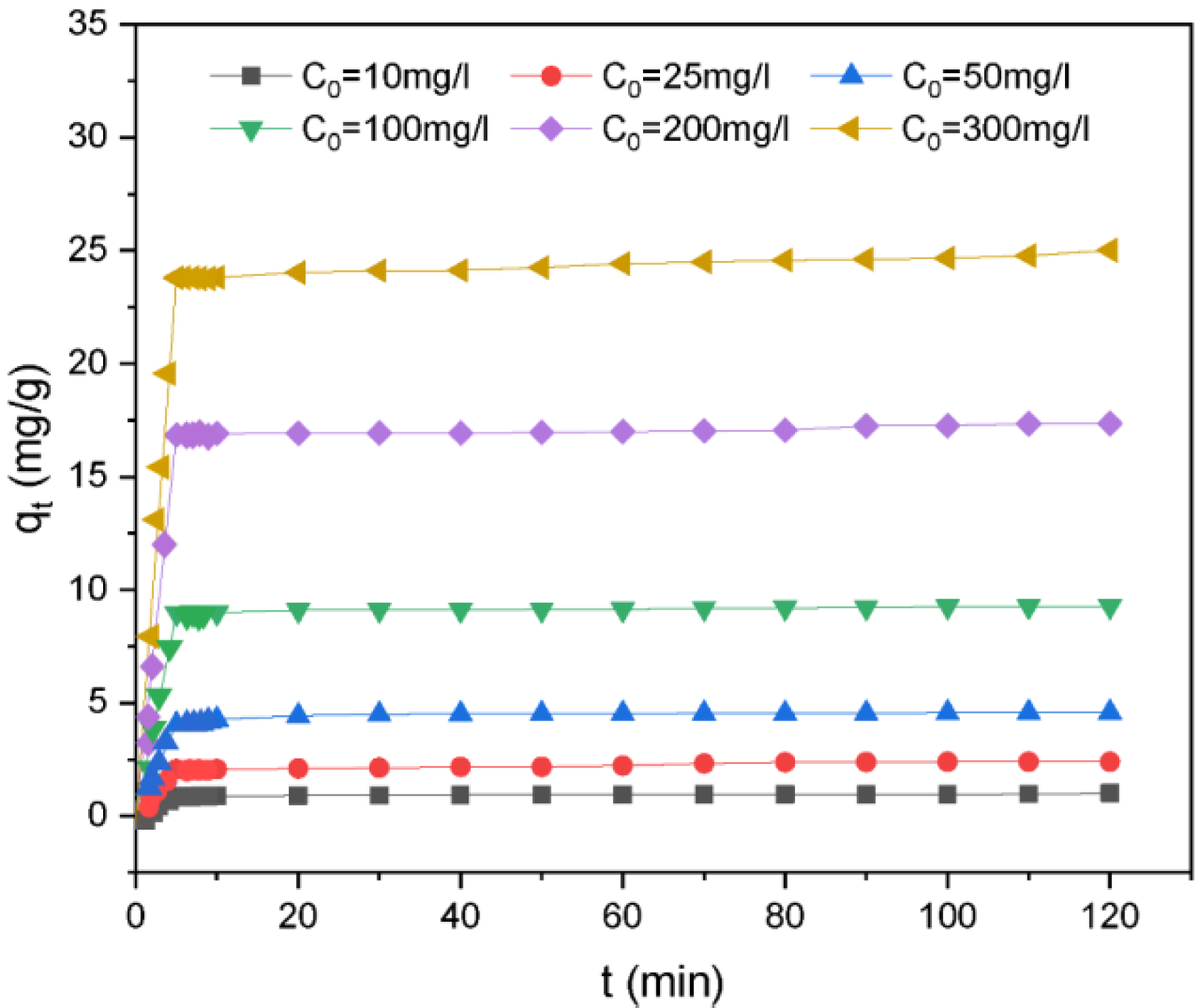 | \begin {equation}\label {eq5} q_{t}= \frac {(C_{0}-C_{t})}{m}\times V \end {equation} | (5) |