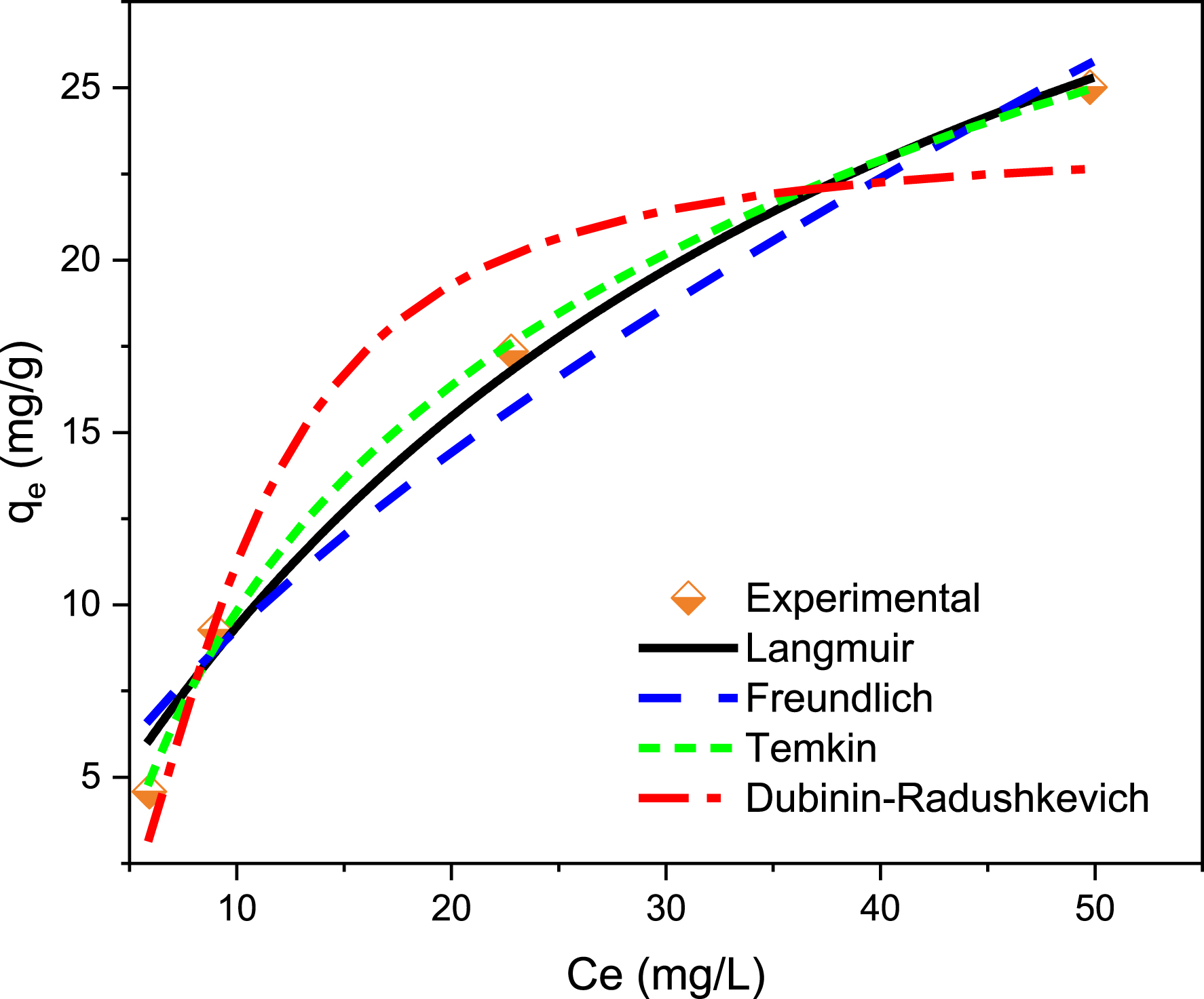 Fitting of the Langmuir, Freundlich, Temkin, and Dubinin–Radushkevich isotherm models to the experimental equilibrium data of SO adsorption by PP. Conditions: C0 = 50–300 mg/L, pHnatural = 5.85,room temperature = 21 ± 2 °C, adsorbent dosage = 10 g/L.