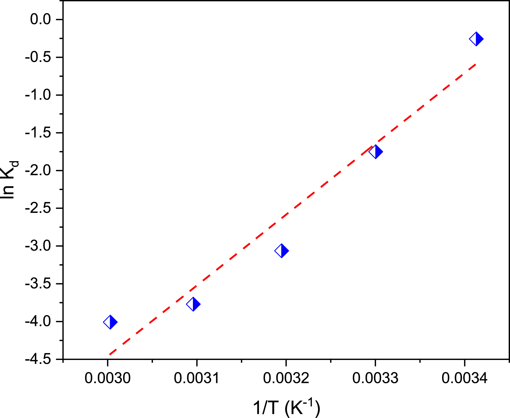 | \begin {eqnarray} \ln K_{d} =\frac {\Delta S}{R}-\frac {\Delta H}{RT} \label {eq29} \end {eqnarray} | (29) |