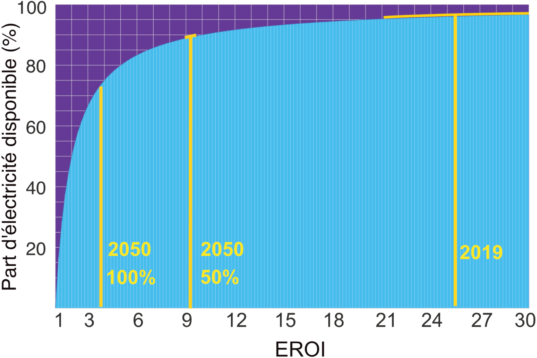 Pourcentage d’électricité disponible pour la société (surface bleue) après retrait de la dépense d’exergie du système électrique (surface violette) en fonction de l’EROI du système électrique. De droite à gauche, les droites verticales jaunes situées à la moyenne des EROI des bouquets électriques : en 2019, pour le bouquet 50 % ENR (et 50 % nucléaire) et pour le bouquet 100 % de Négawatt. Les traits jaunes à la séparation des deux surfaces montrent la dispersion autour de leur moyenne des EROI suivant les valeurs d’EROI des filières de la littérature [1].