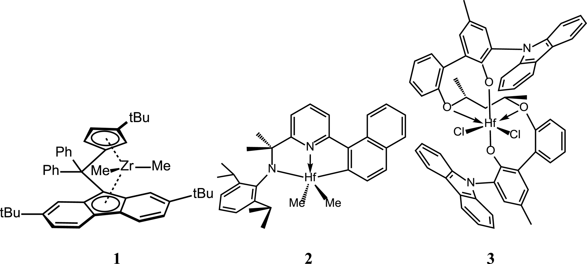 Structures of the catalyst precursors used [Ph2C(3-tBu-Cp)(2,7-tBu2Flu)]ZrMe2 (1), [1-C10H6-5-(CMe2-2,6-iPr2-C6H3)-C6H3N]HfMe2 (2) and {CH2[CH(Me)O-C6H4-2-(2-NC12H8)-4-Me-C6H2O]2}HfCl2 (3).