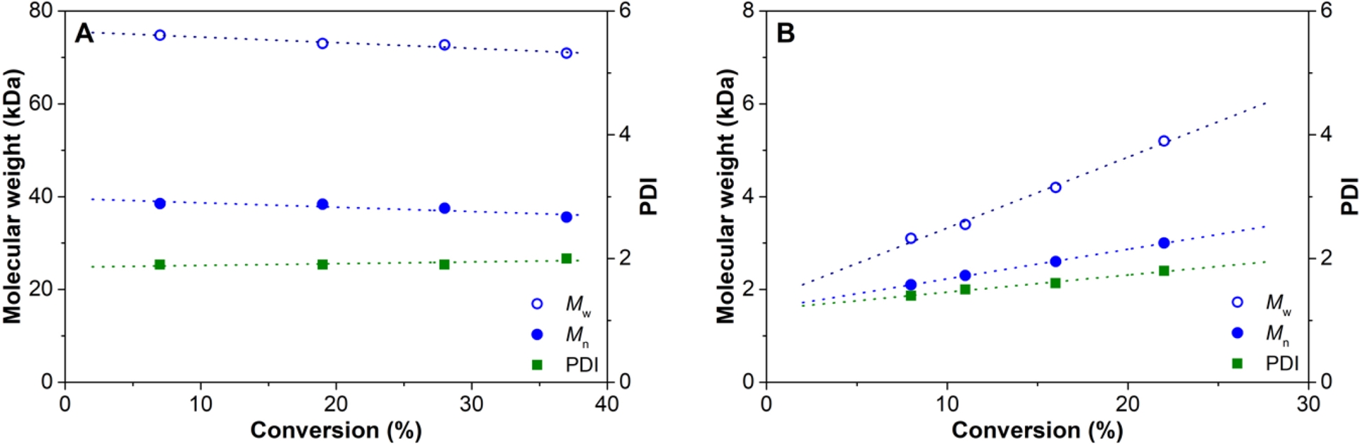 Molecular weight and polydispersity index (PDI) as a function of conversion for 4M1P polymerization at 60 °C using 2/AB/DiBAP as catalyst system: (A) without DEZ and (B) with DEZ (Table 3).