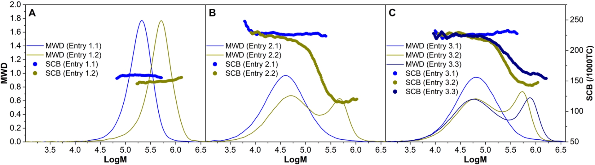 Molecular weight distributions (MWD) and branching densities per 1000 total nr. of carbons (SCB/1000TC) obtained by high-temperature size exclusion chromatography of: (A) poly(ethylene-co-4M1P) random copolymer (Table 2, entry 1), (B) poly(4M1P-block-(ethylene-co-4M1P)) diblock copolymer (Table 2, entry 2) and (C) poly(4M1P-block-(ethylene-co-4M1P)-block-4M1P) triblock copolymer (Table 2, entry 3).