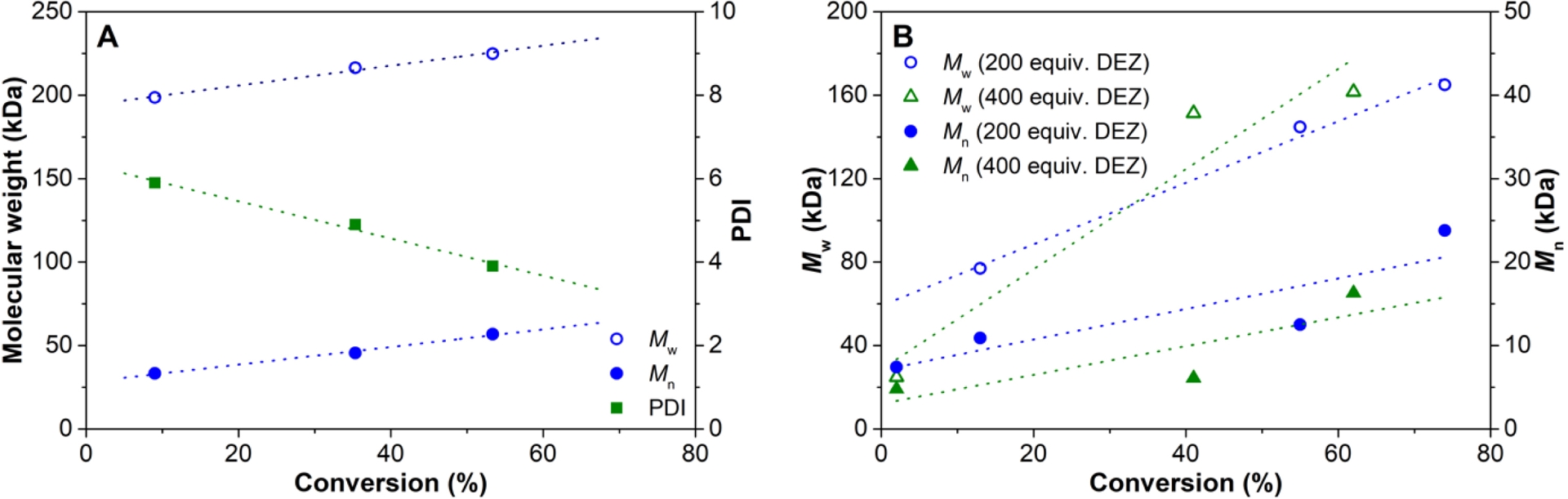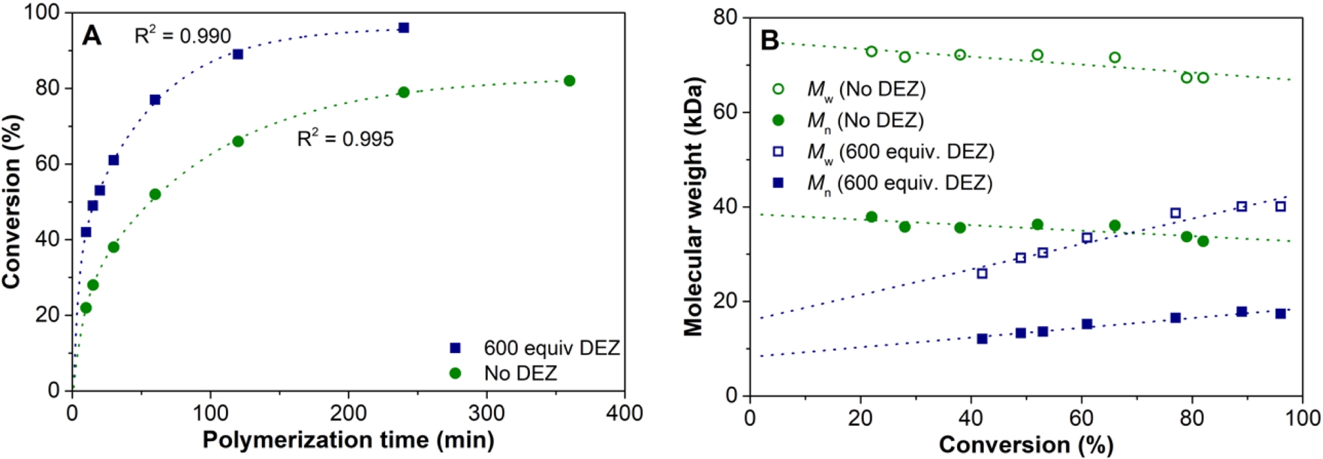 (A) Conversion versus polymerization time and (B) molecular weight as a function of conversion for 1-octene polymerization at 100 °C, without and with 600 equiv. of DEZ (Table S7).