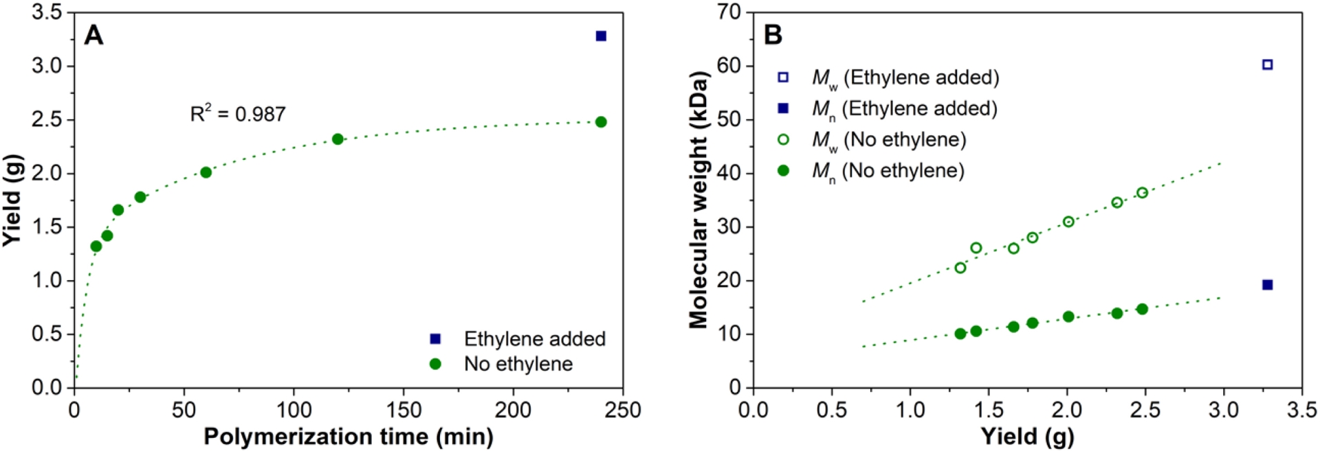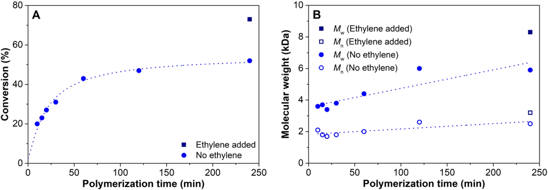 (A) 1-Octene conversion as a function of time using 3/1.5 TTB/100 TMA/600 DEZ at 100 °C. Addition of ethylene after 120 min. (B) Molecular weight as a function of yield, without and with addition of ethylene after 120 min (Table S8).