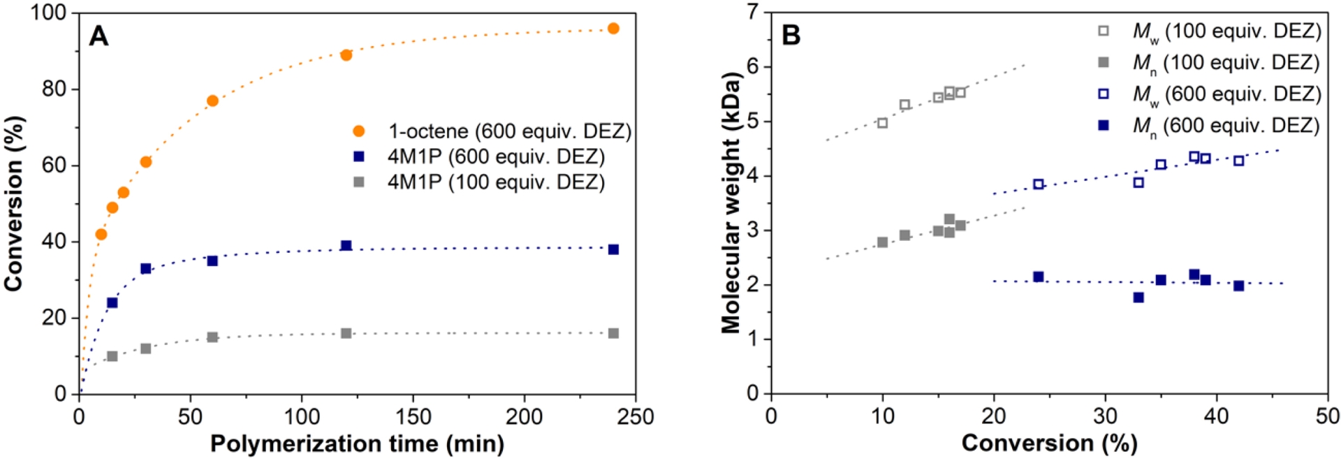 (A) Comparative conversion versus polymerization time plot for the 1-octene (Table S7) and 4M1P (Table S10) polymerizations and (B) molecular weight as a function of conversion for 4M1P polymerization with 100 and 600 equiv. of DEZ versus catalyst (Table S10), using the 3/TTB/TMA/DEZ system at 100 °C.