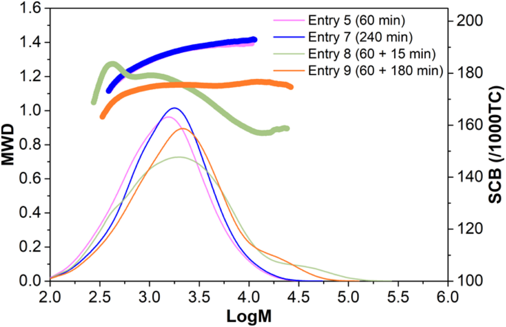 Molecular weight distributions (MWD) and short-chain branching (SCB) obtained by high-temperature size-exclusion chromatography of (i) P4M1P after 60 min (Table S11, entry 5), (ii) P4M1P after 240 min (Table S11, entry 7) and (iii) poly(4M1P-block-(ethylene-co-4M1P)-block-4M1P) triblock copolymer (Table S11, entry 8) applying the 3/MAO/DEZ system.