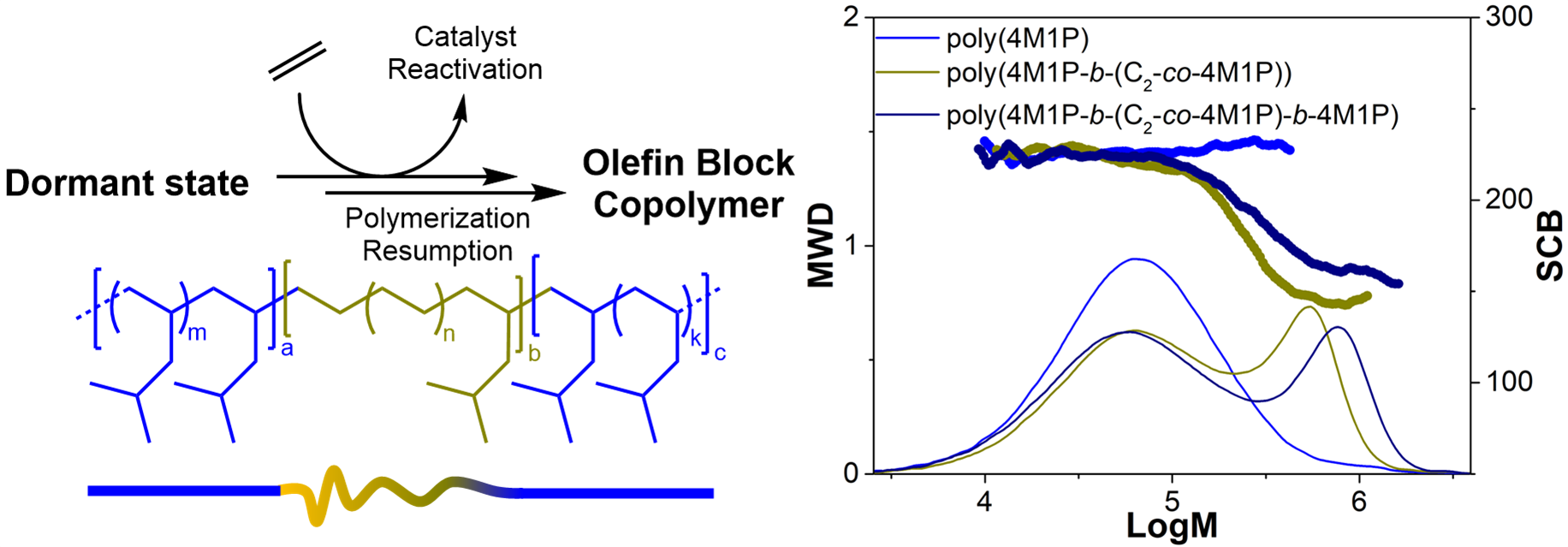 As the upper service temperature of thermoplastic elastomers is governed by the material’s Tm or high Tg, even OBCs containing hard segments of polyethylene and polypropylene have their thermal limitations. OBCs based on high-melting polyolefin blocks, such as poly(4-methyl-1-pentene) (P4M1P, having a Tm above 250 °C), would be desirable as such thermoplastic elastomers could compete with thermoplastic polyurethanes, silicones, and fluorocarbon elastomers in various temperature-demanding applications.