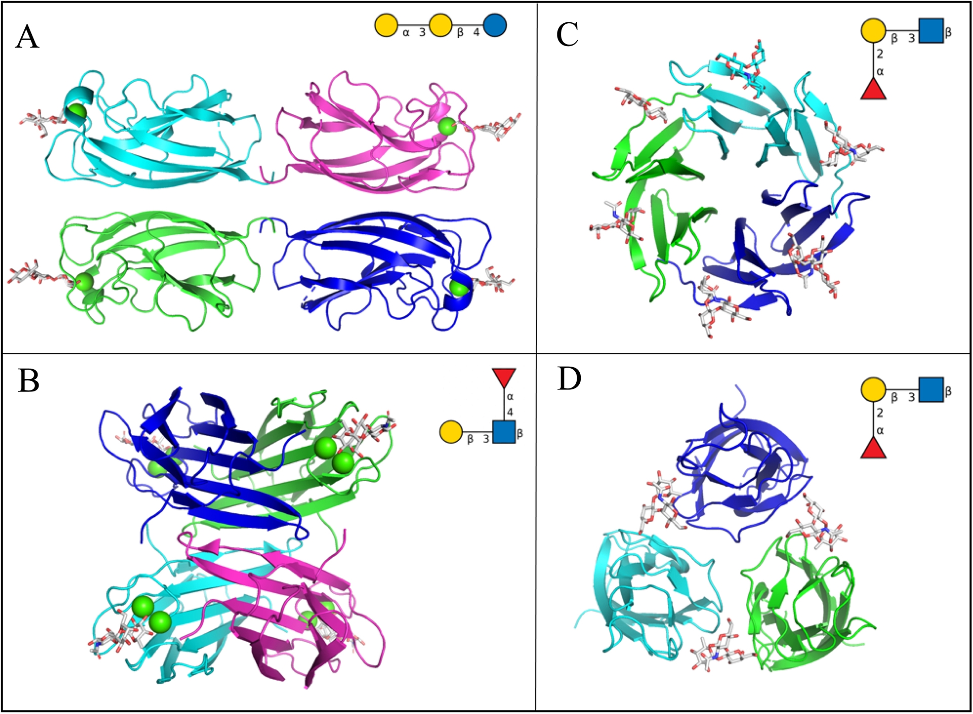 Crystal structures of soluble lectins from bacterial pathogens in their oligomeric form and in complex with human glycan epitopes. (A) LecA from P. aeruginosa complexed with iso-Gb3 trisaccharide Gal(α1-3)Gal(β1-4)Glc, PDB 2VXJ. (B) LecB from P. aeruginosa complexed with Lewis a trisaccharide Gal(β1-3)[Fuc(α1-4)]GlcNAc, PDB W8H. (C) BambL from B. ambifaria complexed with H-type 1 trisaccharide Fuc(α1-2)Gal(β1-3)GlcNAc, PDB 3ZW2. (D) Bc2LC-nt from B. cenocepacia complexed with H-type 1 trisaccharide Fuc(α1-2)Gal(β1-3)GlcNAc, PDB 6TID. Proteins are represented by ribbons colored by chains, glycans by sticks, and calcium ions by green spheres (Pymol, Schrödinger). Oligosaccharide ligands are also represented as cartoons using the Symbol Nomenclature for Graphical Representations of Glycans [23] (Gal: yellow circle; Fuc: red triangle; Glc: blue circle, GlcNAc: blue square).