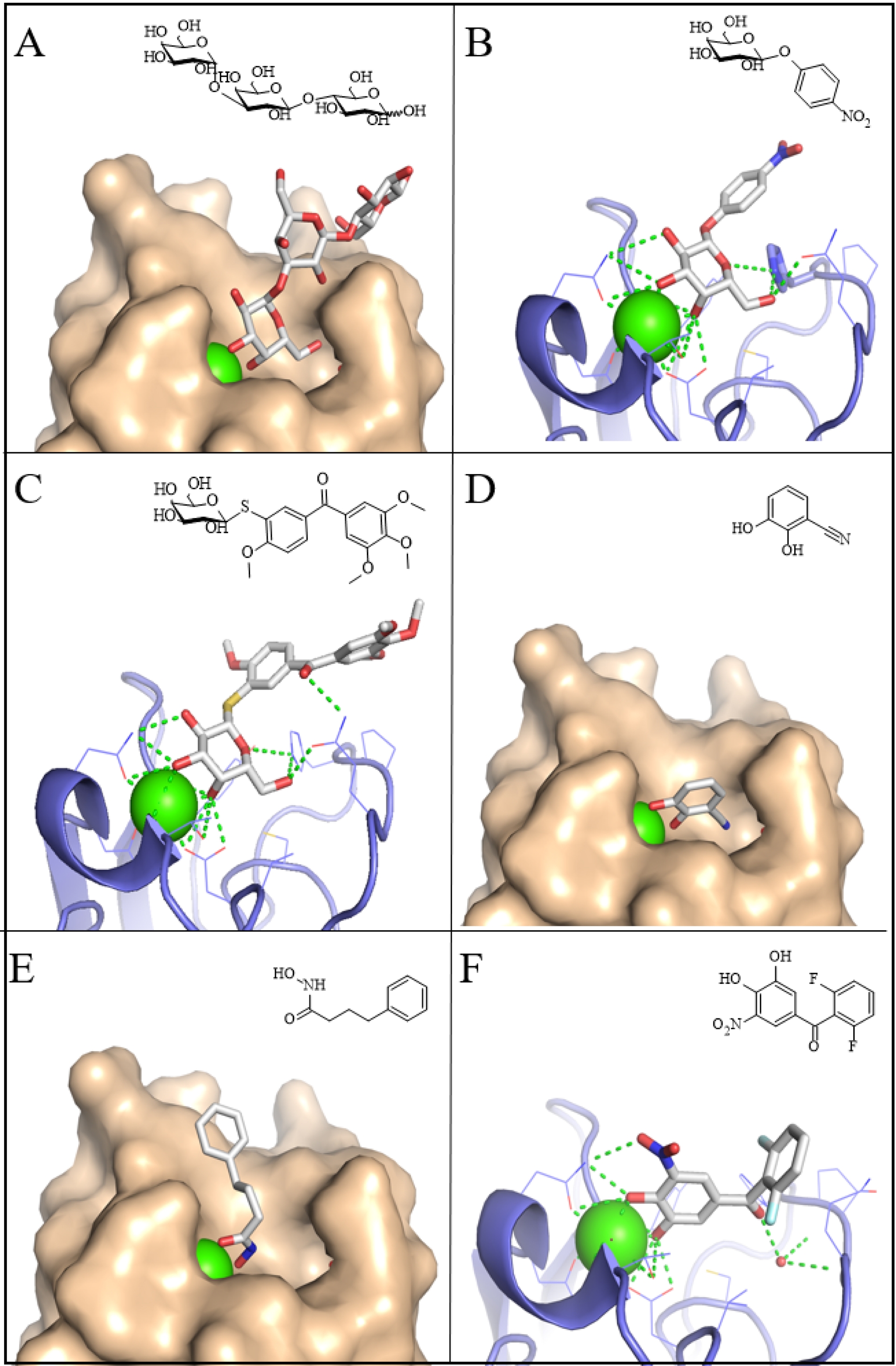 Crystal structures of LecA (surface in beige and ribbon in blue) complexed with natural and synthetic ligands. (A) Gal(α1-3)Gal(β1-4)Glc, PDB 2VXJ. (B) p-Nitrophenyl-β-galactoside, PDB 3ZYF. (C) Diarylthiogalactoside, PDB 7Z63. (D) Cyanocatechol, PDB 6YO3. (E) Phenylbutyryl hydroxamic acid, PDB 7FJH. (F) Difluoro tolcapone derivative, PDB 9I7Z. Schematic representation of ligands is displayed in the right upper corner of each panel (ChemSketch, ACD/Labs).