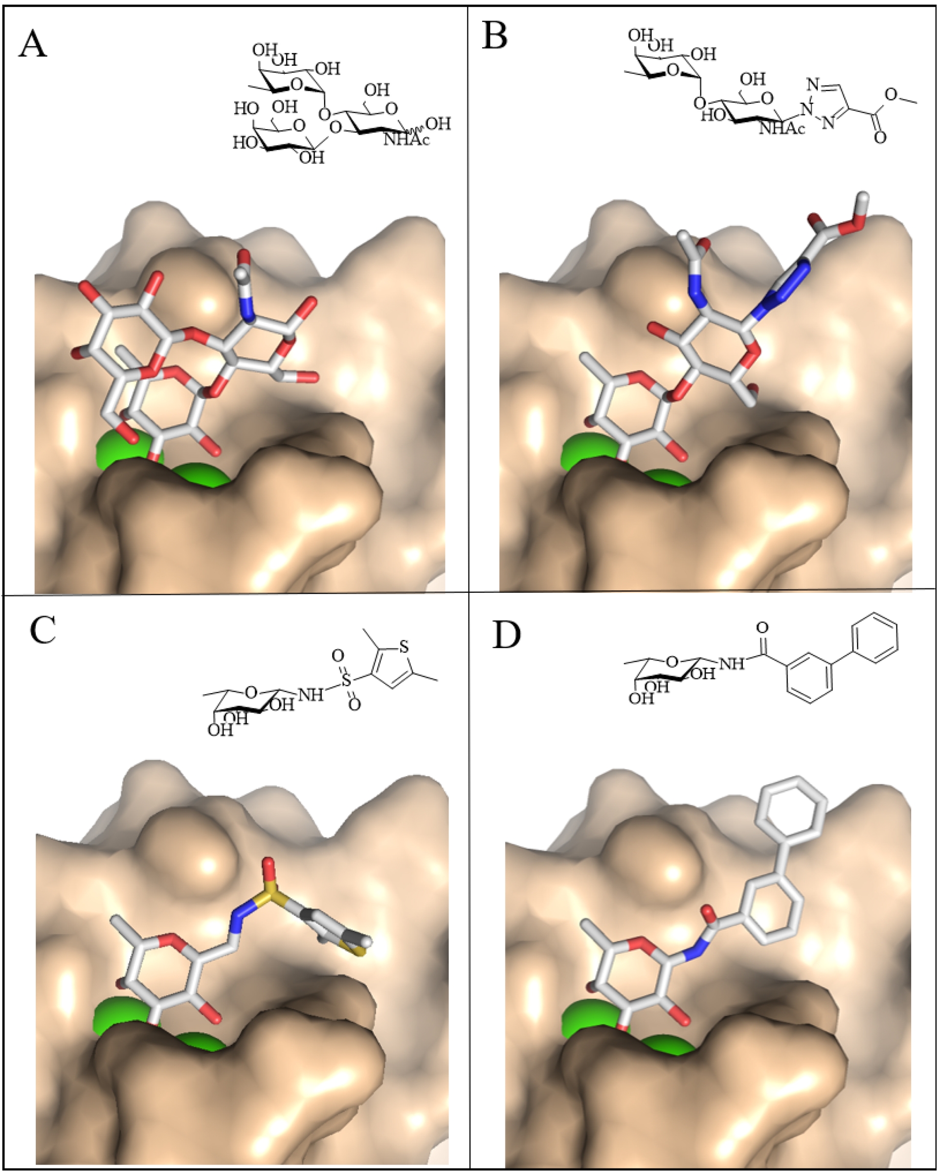 Crystal structures of LecB (surface in beige) complexed with natural and synthetic ligand. (A) Gal(β1-3)[Fuc(α1-4)]GlcNAc, PDB W8H. (B) Fuc(α1-4)GlcNAc triazole derivative, PDB 2JDK. (C) β-Fucopyranosyl-thiophenesulfonamide derivative, PDB 5MAZ. (D) β-Fucopyranosyl-biphenyl-3-carboxamide, PDB 8AIY. Schematic representation of ligands is displayed in the right upper corner of each panel (ChemSketch, ACD/Labs).