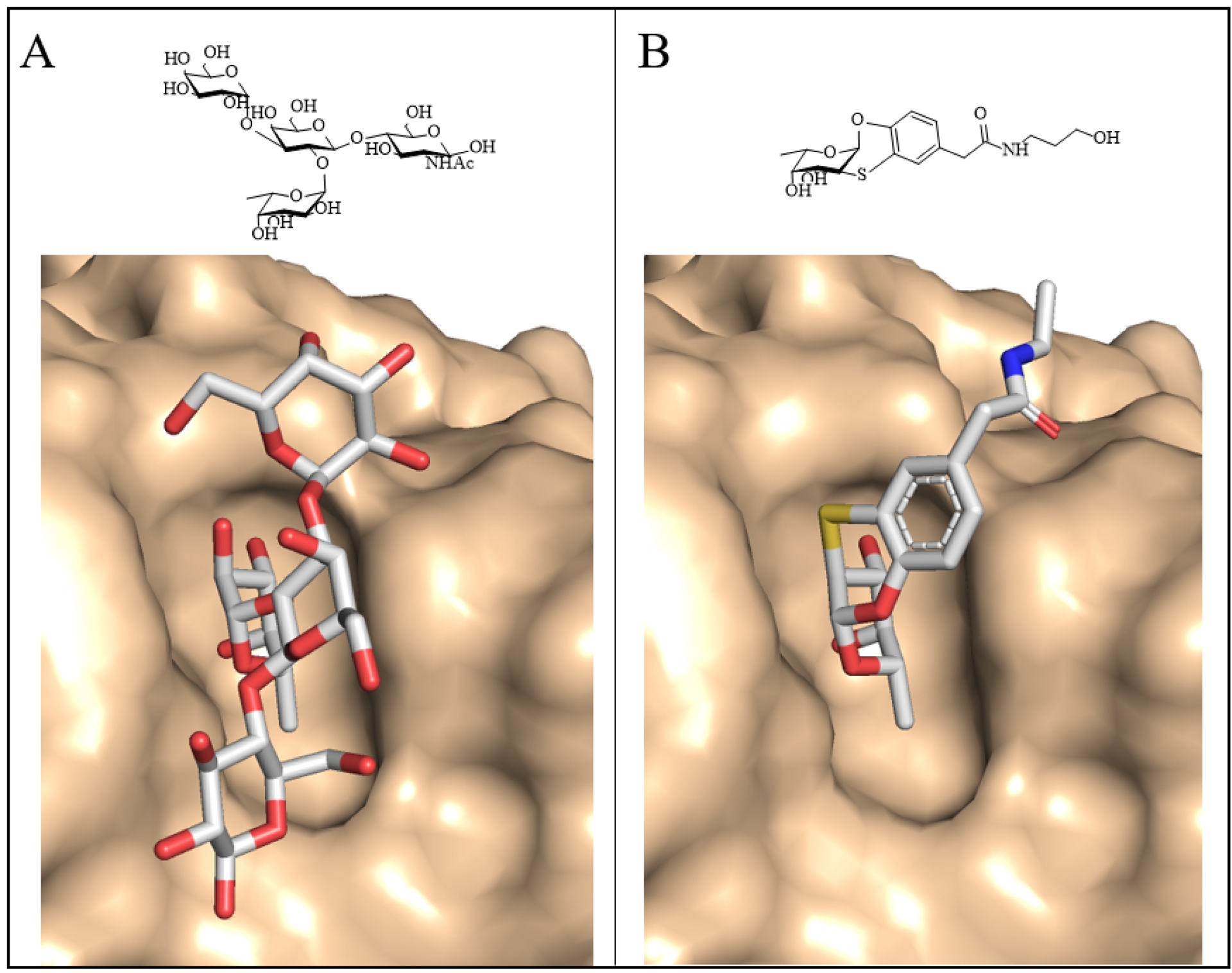 Crystal structures of BambL (surface in beige) complexed with natural and synthetic ligands. (A) Gal(α1-3)[Fuc(α1-2)]Gal(β1-4)GlcNAc, PDB 3ZWE. (B) Conformationally constrained fucose-based glycomimetics, PDB 6ZFC. Schematic representation of ligands is displayed in the right upper corner of each panel (ChemSketch, ACD/Labs).
