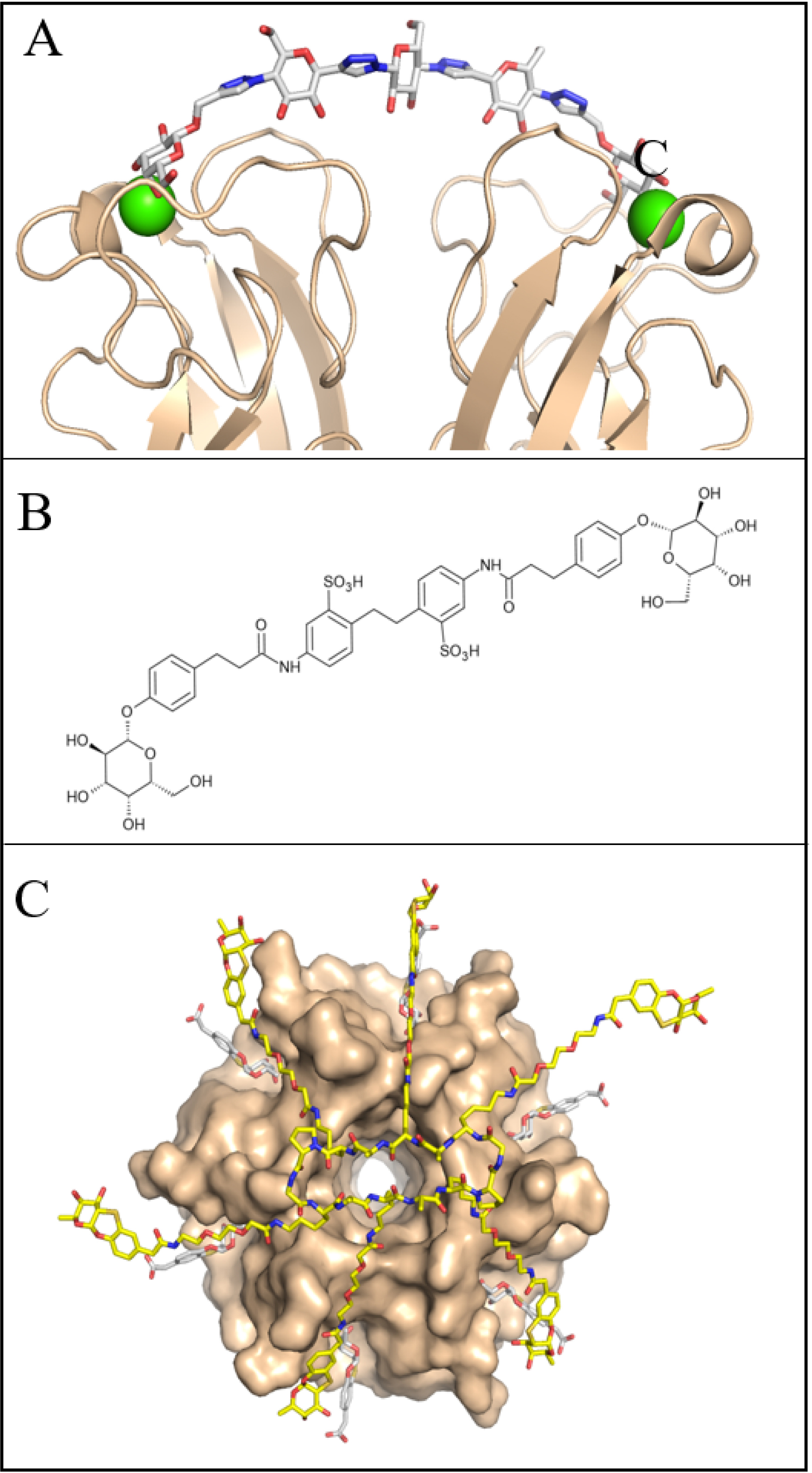 Some multivalent glycosides with high affinity for bacterial lectins. (A) Divalent galactoside with triazolyl–glucose-based linker in complex with LecA (surface in beige, crystal structure PDB 4YWA). (B) Divalent galactoside with aromatic-based linker also binding to LecA. (C) Pentavalent fucoside with high affinity for BambL (model superimposed on crystal structure, PDB 6ZFC).