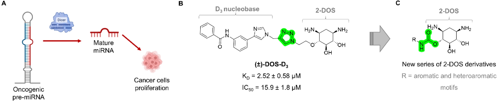 (A) General process of pre-miRNA cleavage by Dicer to produce the mature miRNA. When the miRNA is oncogenic, its production induces the proliferation of cancer cells, and the pre-miRNA represents a potential target for small molecules to block cancer cell proliferation. (B) Chemical structure of a previously identified pre-miR-372 binder based on 2-DOS conjugated via a triazole linker to a heteroaromatic motif to form DOS-D3. (C) General chemical structure of the 2-DOS conjugates prepared in this study.