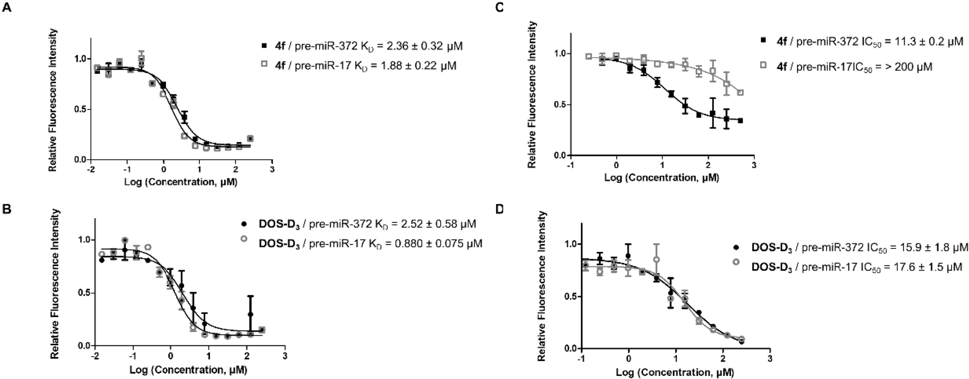 (A) Dissociation constants curves for compound 4f against pre-miR-372 (full black squares) and pre-miR-17 (empty grey squares) with the associated KD values. (B) Dissociation constants curves for compound DOS-D3 against pre-miR-372 (full black circles) and pre-miR-17 (empty grey circles) with the associated KD values. (C) Inhibition curves for the processing of pre-miR-372 (full black squares) and pre-miR-17 (empty grey squares) by Dicer in the presence of compound 4f and the associated IC50 values. (D) Inhibition curves for the processing of pre-miR-372 (full black circles) and pre-miR-17 (empty grey circles) by Dicer in the presence of compound DOS-D3 and the associated IC50 values.