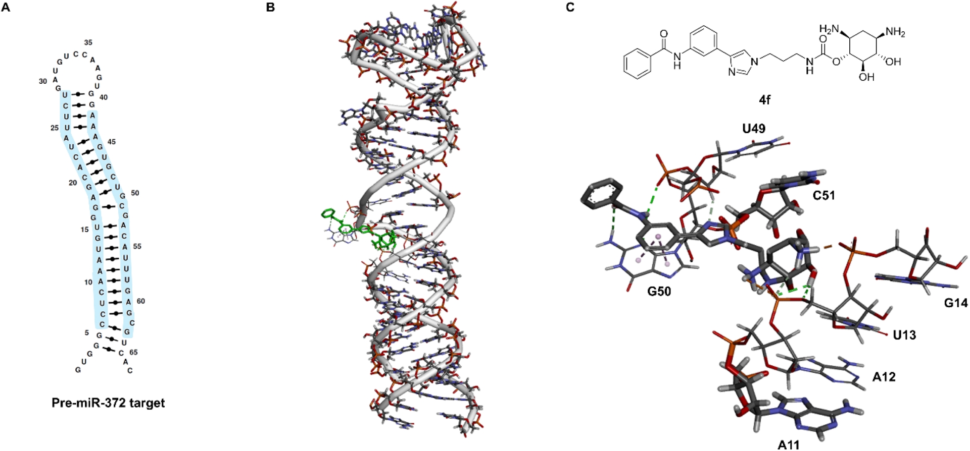 (A) Primary and secondary structures of pre-miR-372 RNA target. (B) Docking of compound 4f with the pre-miR-372 hairpin loop performed using Autodock 4 in which the grid boxes were fixed on the entire RNA sequence. (C) Chemical structure of compound 4f and detail of the binding pocket and interactions formed.
