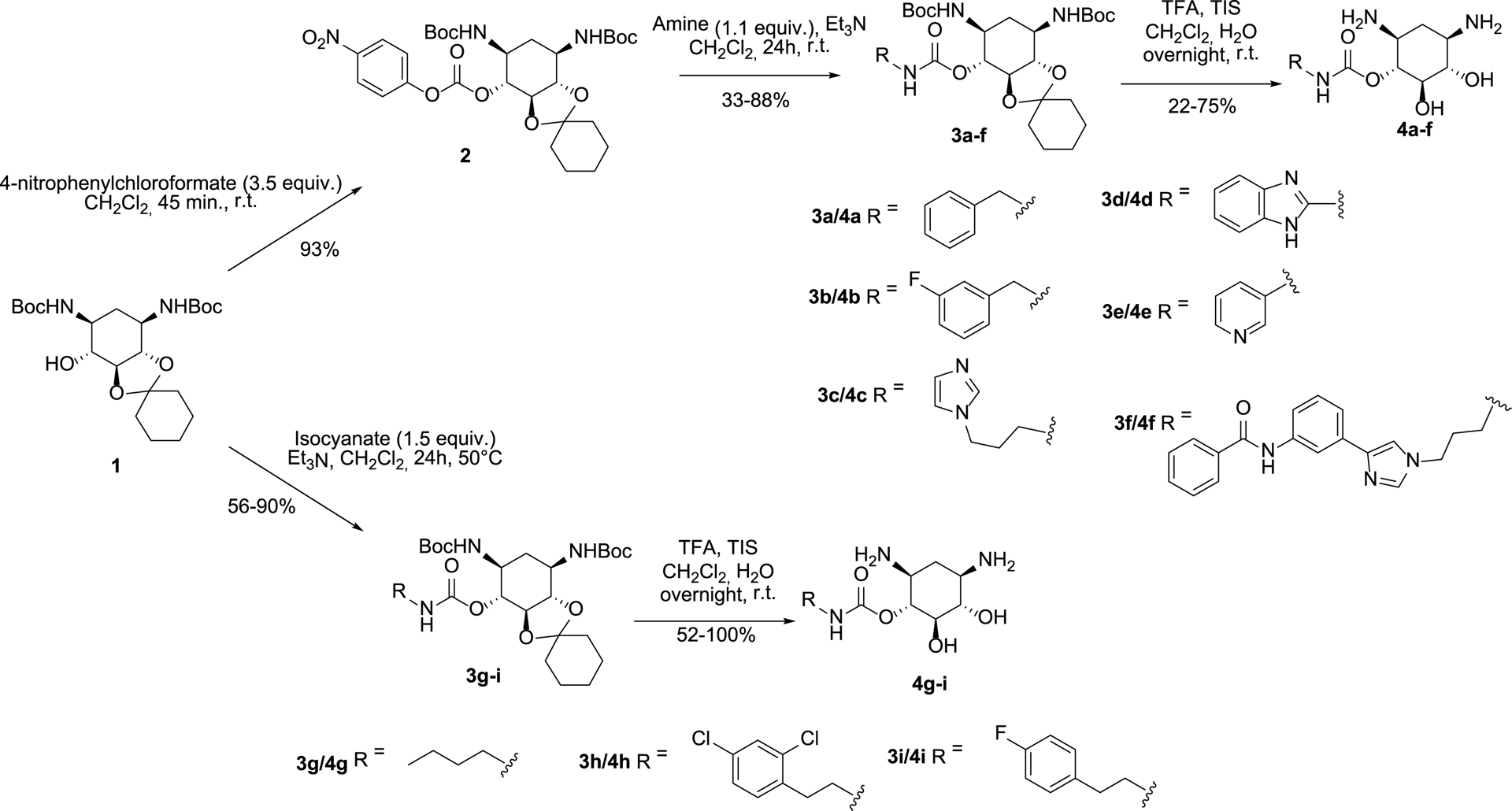 2-DOS represents an ideal platform for the development of RNA binders since it bears two cis-amino groups recognized as very important for RNA binding and hydroxyl groups that can be functionalized [20, 21]. We thus decided to substitute one of the hydroxyl groups with various aromatic and heteroaromatic substituents via the formation of a carbamate linker. Carbamates show many advantages, such as the ability to permeate the cell membrane as well as a particular chemical stability. For these reasons, carbamates have been used in the design of various drugs, such as β- and γ-secretase inhibitors, carbamate-based Hepatitis C virus (HCV) therapeutics or cysteine-protease inhibitors [19]. To prepare new conjugates with 2-DOS, we chose to conjugate various aromatic and heteroaromatic compounds (R in Figure 1B). First, we chose phenyl substituents containing or not fluorine atom(s) because this kind of substituent could interact with RNA by forming hydrophobic interactions or through unusual hydrogen bonds mediated by the fluorine atoms. Then, we chose heteroaromatic compounds such as imidazole, benzimidazole, pyridine, and the previously employed D3 nucleobase [N-(3-(1-(3-aminopropyl)-1H-imidazol-4-yl)phenyl)benzamide]. To obtain a novel series of ligands with high RNA binding affinity and miRNA inhibitory activity, we thus employed commercially available substrates as well as starting materials prepared using straightforward synthetic pathways. To synthesize the carbamate compounds, we decided to start from the previously prepared protected racemic compound 1 [17] and to use two approaches (Scheme 1): (i) preparation of the activated carbonate 2 followed by amine substitution leading to compounds 3a–f, and (ii) reaction of the free alcohol of 1 with various isocyanates leading to compounds 3g–i.