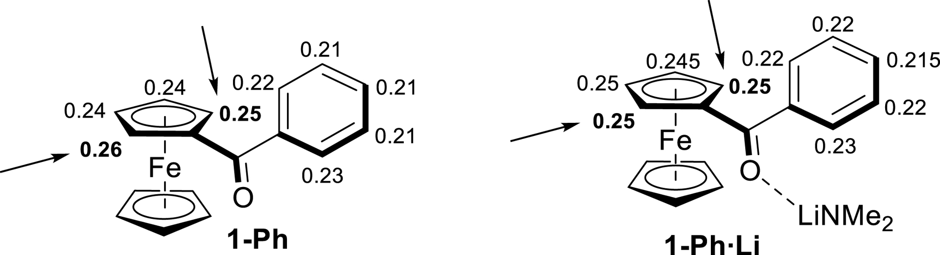 Natural-population-analysis charges on hydrogen atoms in the isolated molecule of benzoylferrocene (1-Ph) and impact of coordination to lithium on these charges (complex of 1-Ph with LiNMe2).