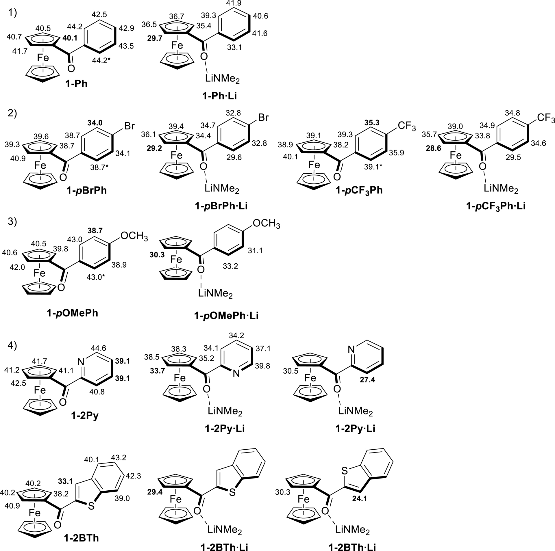 However, formation of the thermodynamic product can also be observed in reactions using strong lithium dialkylamides such as LiTMP [57, 58, 59]. We therefore also calculated significant pKa values for several aroyl ketones in THF within the DFT framework [60, 61, 62, 63] (see Figure S2 in Supplementary material for a complete list). As shown on Figure 2a, the lowest pKa value for 1-Ph corresponds to the ferrocene site next to the carbonyl group. Coordinating the ketone to LiNMe2 (1-PhLi, to mimic the stabilizing effect that the function exerts on the lithiated derivative formed) also seemed to show that the most stable lithium species was the one deprotonated next to the carbonyl group on the ferrocene side (Figure 2a, 1-PhLi).