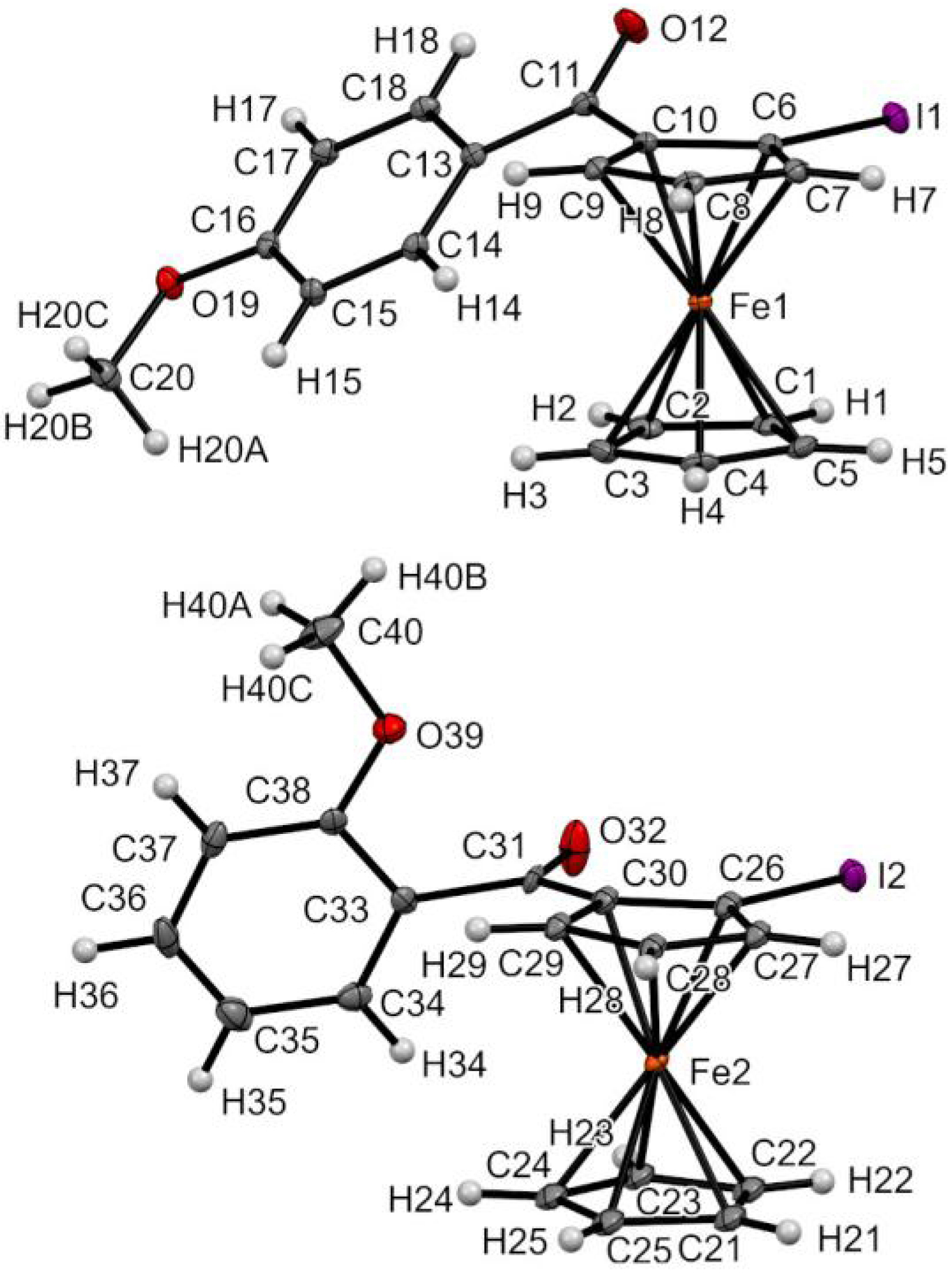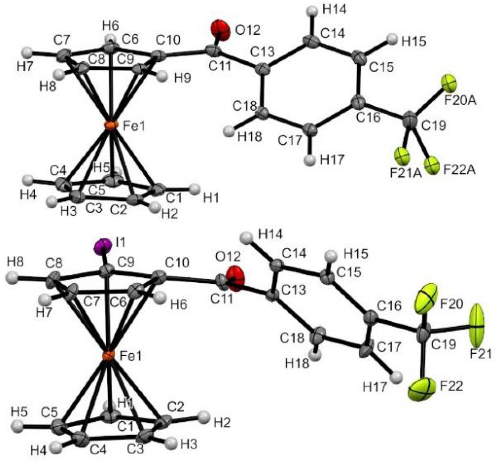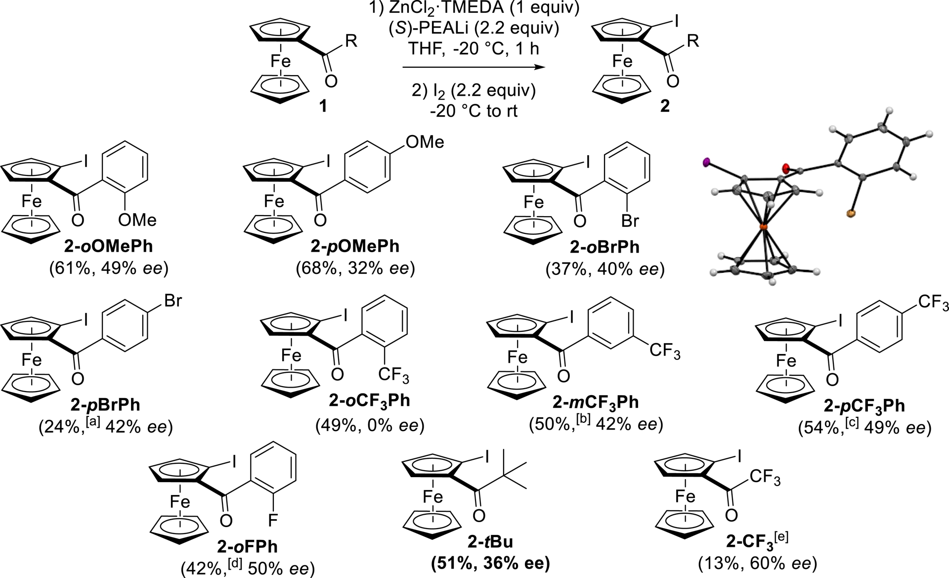 Although ferrocene ketones have been known since the early days of ferrocene chemistry, their behavior in deprotometalation has never been studied in detail. Here, we have optimized this reaction using lithium 2,2,6,6-tetramethylpiperidide in tetrahydrofuran containing ZnCl2·N,N,N',N'-tetramethylethylenediamine as an in-situ trap. Numerous 2-iodoferrocene derivatives were obtained, while a change in regioselectivity was observed for certain aroyl- and heteroaroylferrocenes, in good agreement with our DFT calculations. The development of an enantioselective deprotometalation was also attempted using lithium di[(S)-1-phenylethyl]amide, affording the desired compounds in up to 60% enantiomeric excess (ee). A selection of iodinated derivatives was finally subjected to post-functionalizations, leading to original ferrocene-fused heterocycles, including an enantiopure tetracyclic derivative. A selection of compounds was studied in both electrochemical reduction and oxidation, and weak interactions such as halogen–halogen, halogen–oxygen and chalcogen–chalcogen bonds were identified in the solid state for some new derivatives.