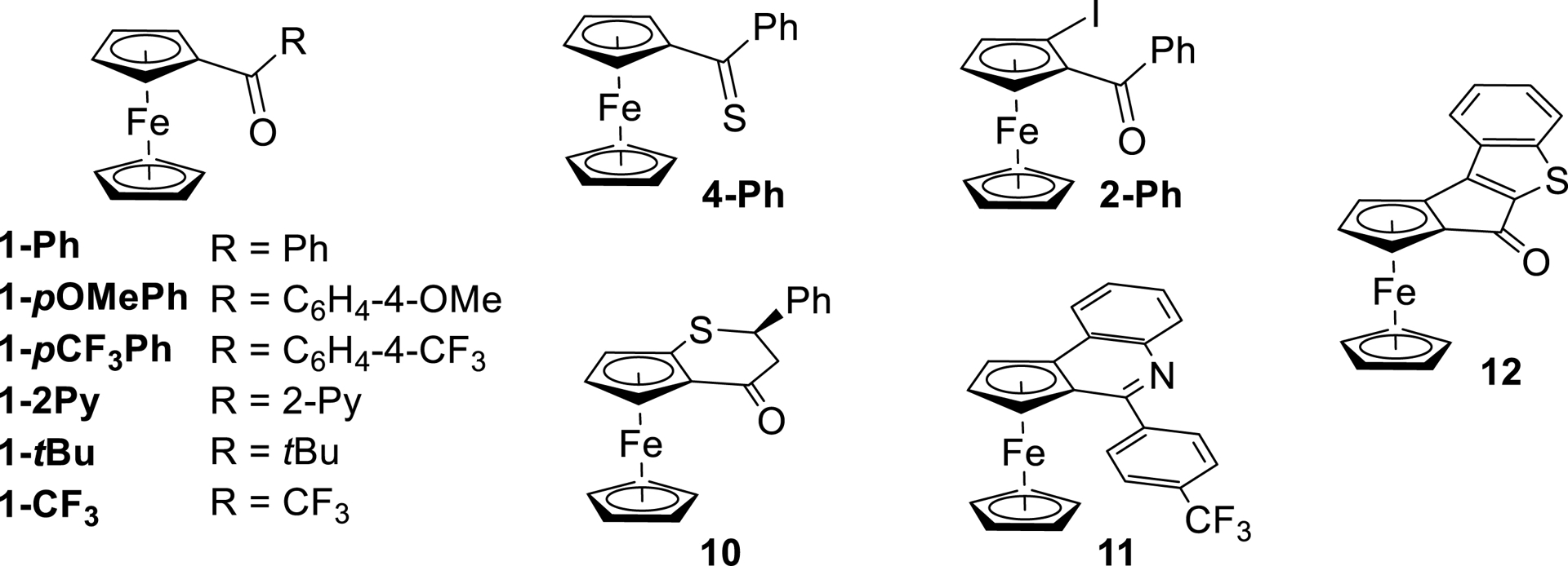 Our aim in this study was twofold: firstly, to identify suitable conditions to functionalize ferrocene ketones by deprotometalation, and secondly, to understand the regioselectivity observed during this reaction. Indeed, most of the ferrocene ketones studied here have two to four sites that can be functionalized in the presence of organometallic bases.