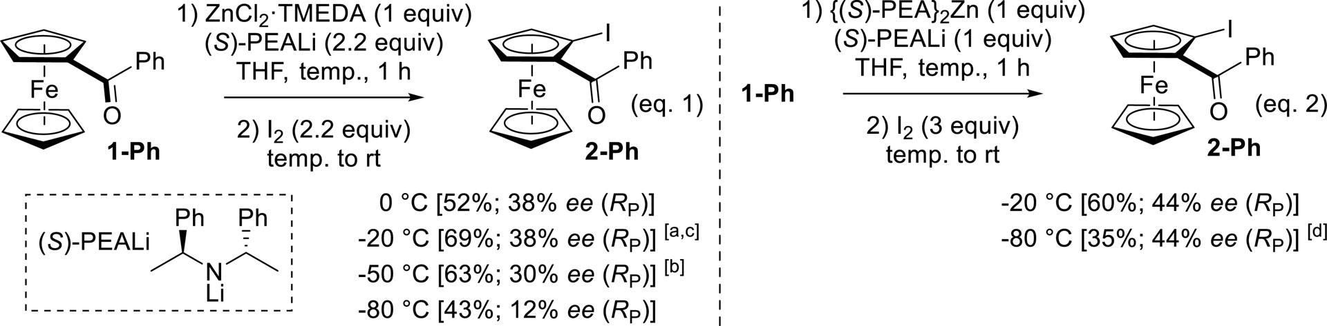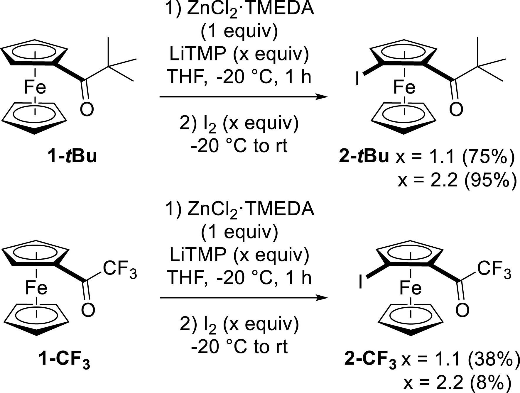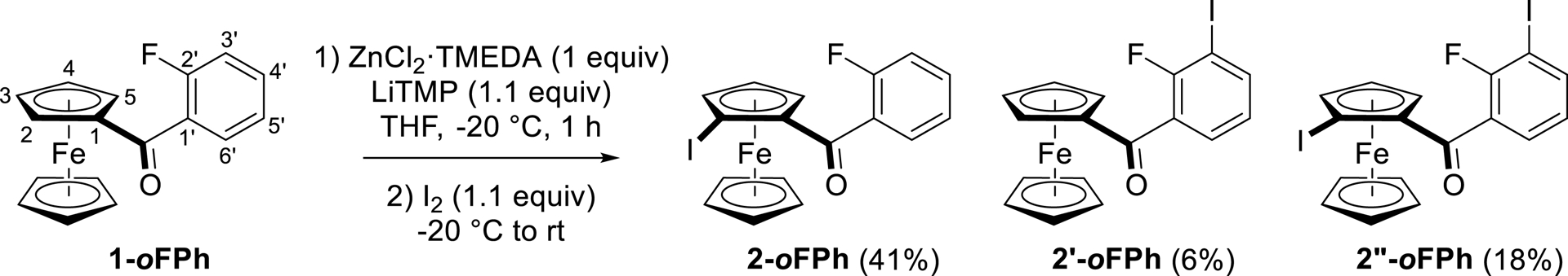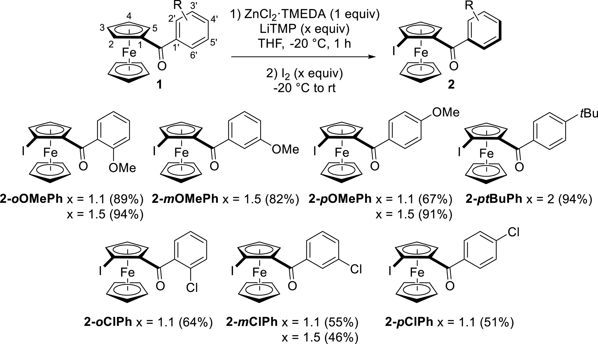In 2010, we reported a synthesis of 1-benzoyl-2-iodoferrocene in 36% yield using a base generated in tetrahydrofuran (THF) from LiTMP (1.5 equiv) and CdCl2⋅TMEDA (0.50 equiv) [46]. Here, our goal is to evaluate an approach using the less toxic ZnCl2⋅TMEDA for the functionalization of ferrocene ketones and to investigate the development of an enantioselective version.