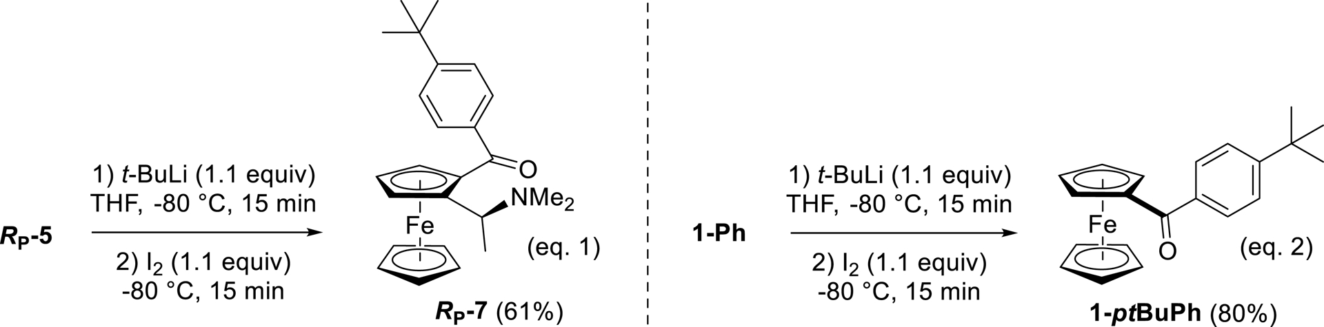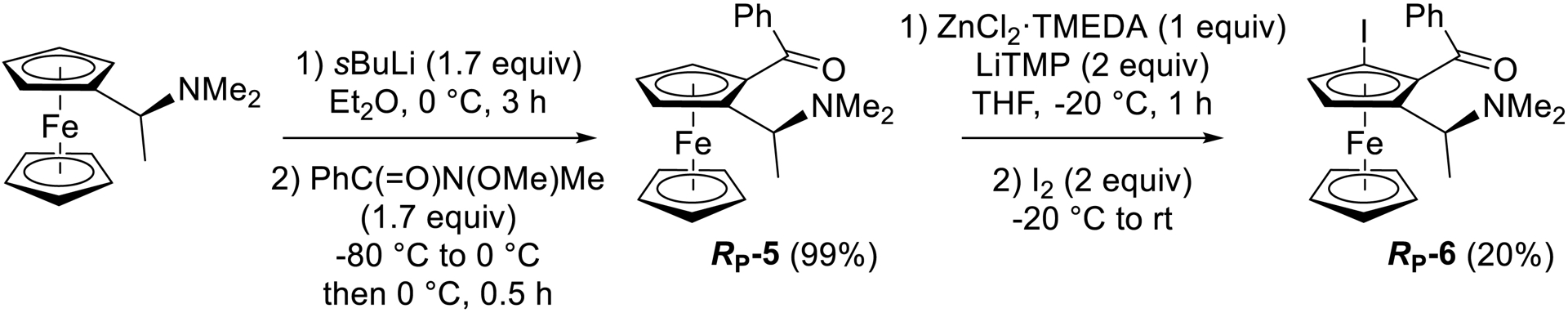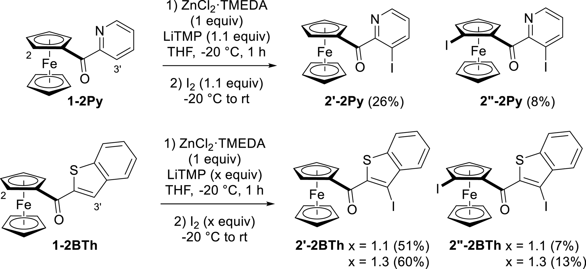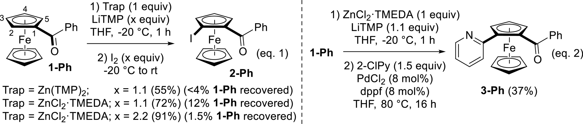 In 2010, we reported a synthesis of 1-benzoyl-2-iodoferrocene in 36% yield using a base generated in tetrahydrofuran (THF) from LiTMP (1.5 equiv) and CdCl2⋅TMEDA (0.50 equiv) [46]. Here, our goal is to evaluate an approach using the less toxic ZnCl2⋅TMEDA for the functionalization of ferrocene ketones and to investigate the development of an enantioselective version.