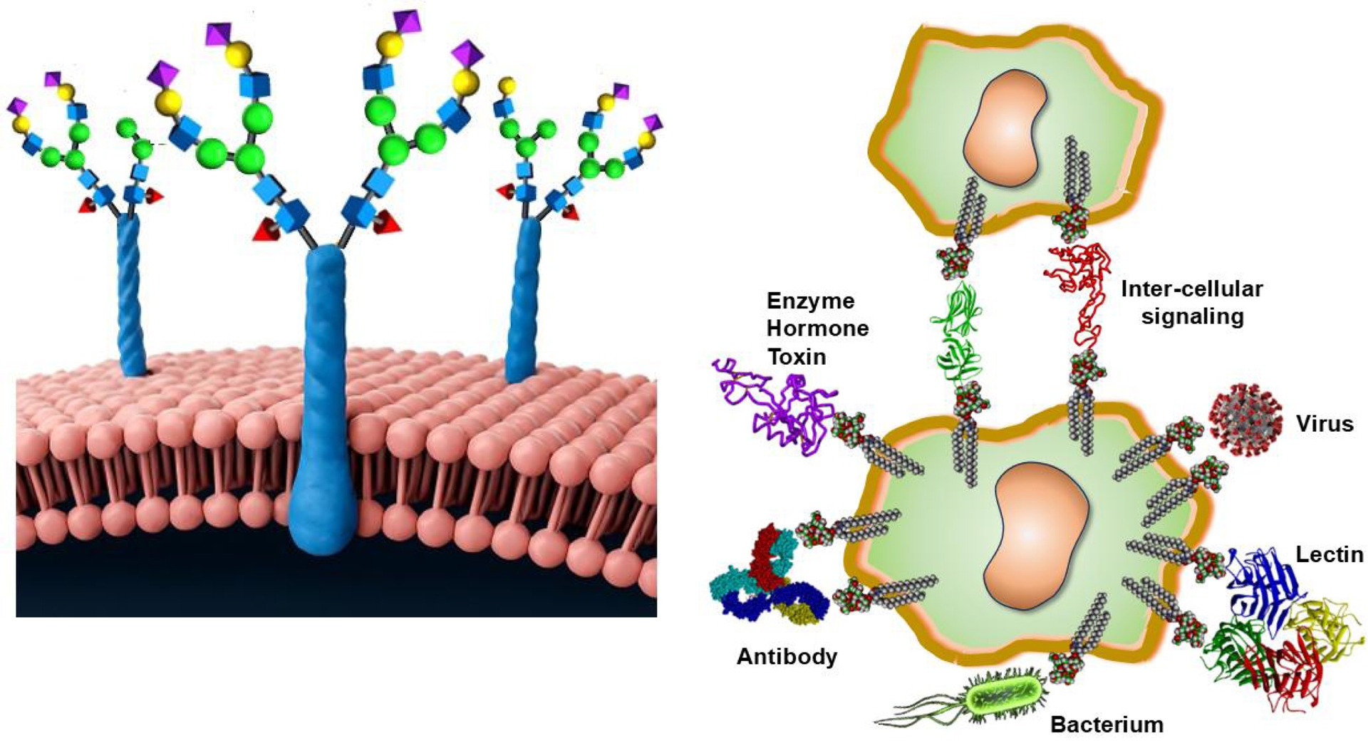 Cell surface glycoconjugates (glycoproteins, glycolipids, and glycoRNA) are fundamental in cellular communications through carbohydrate–protein interactions [1, 2, 3]. In addition, glycans can recognize each other, thus allowing multivalent intercellular events. These numerously and variably exposed saccharides comprising glycoproteins, glycolipids, and polysaccharides, such as glycosaminoglycans, are responsible for a plethora of biochemical processes, including signaling, immune function, cell adhesion, and pathogen recognition (Figure 1). Not surprisingly, they are intrinsically involved in cancer vaccines for viral and bacterial infections, and they constitute highly efficient targeting elements for gene and drug delivery, particularly as nanoparticles.