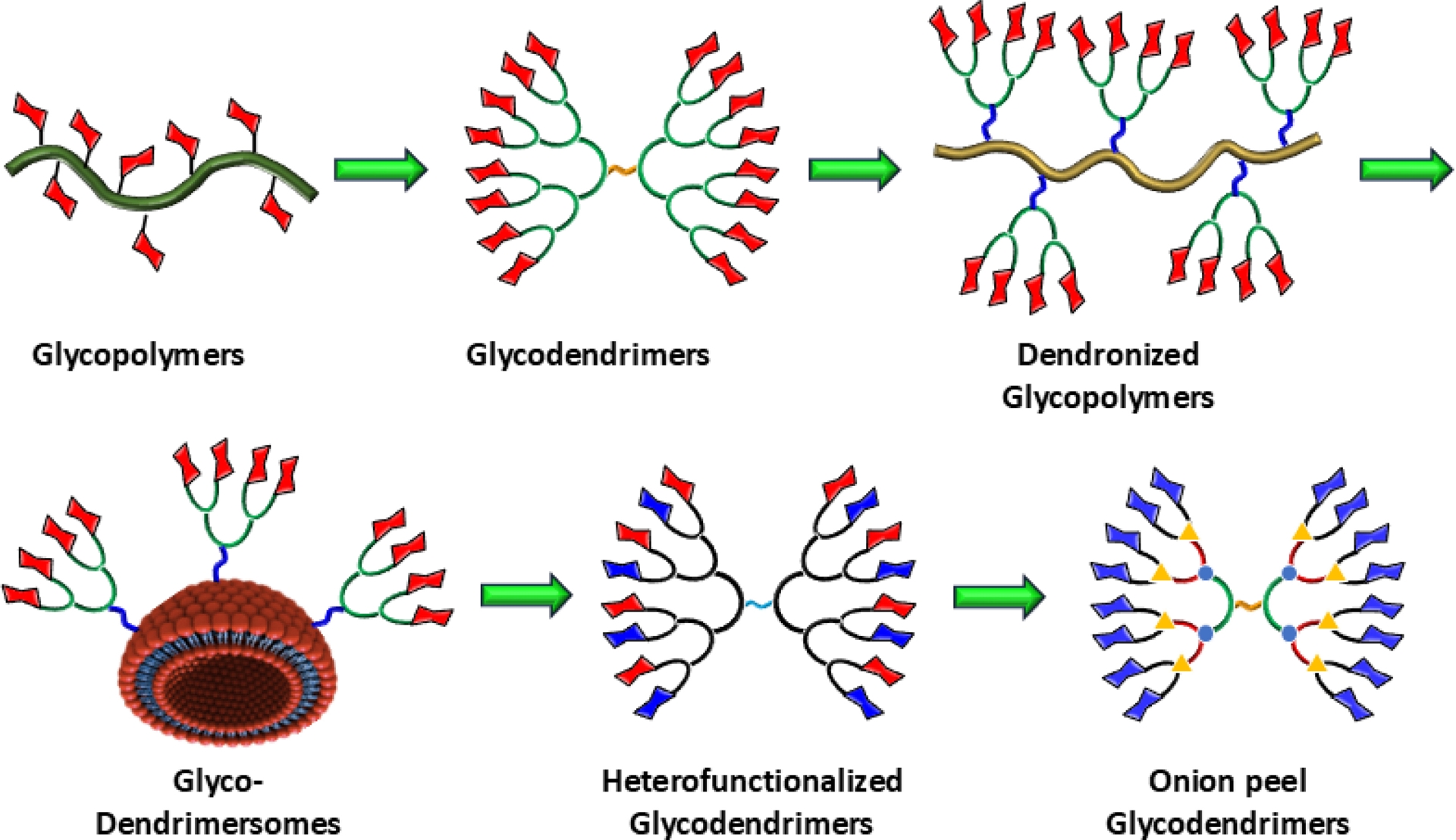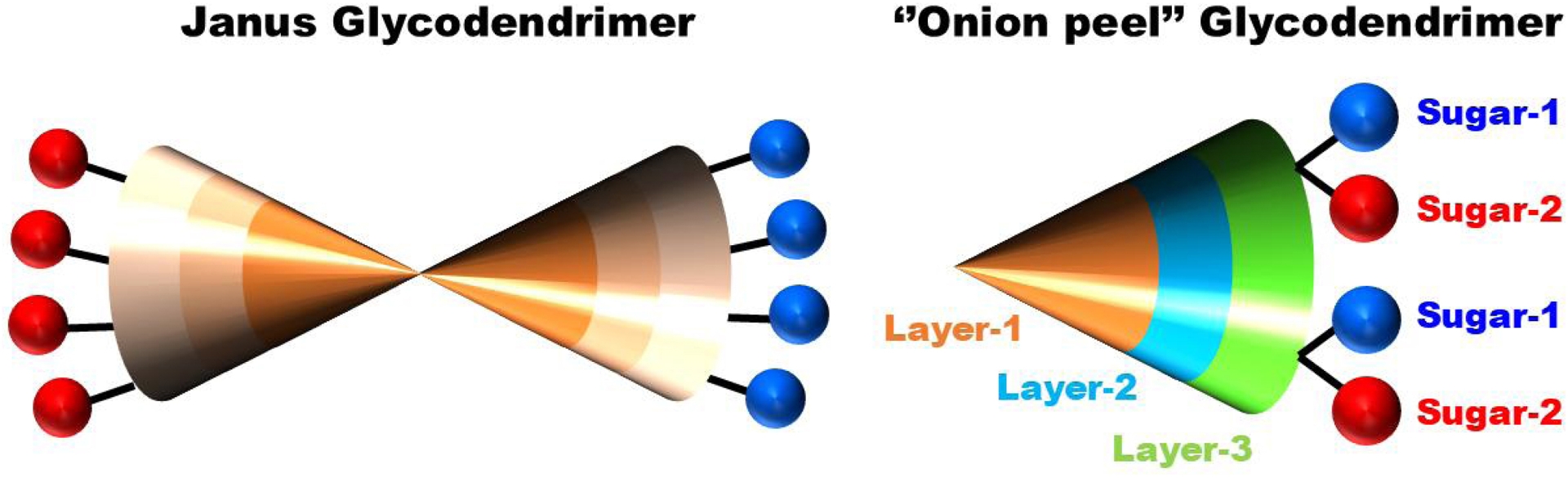 As mentioned, these typical convergent, divergent, and accelerated methodologies are commonly created on repetitive synthetic sequences built with identical chemical motifs. Yet, to address the complexity, multivalency, and structural variety of carbohydrate receptors, we embarked on an alternative strategy through which glycodendrimers were built with varied chemical building blocks that offer the required flexibilities and specific targeting abilities [39]. The strategy, designated as “onion peel”, allows the synthesis of “heterolayered” glycodendrimers encompassing a wide range of chemical scaffolds varying in chemical, physical, and biochemical properties [32, 33, 40, 41, 42, 43, 44, 45, 46, 47]. This short review highlights our own work in this area.