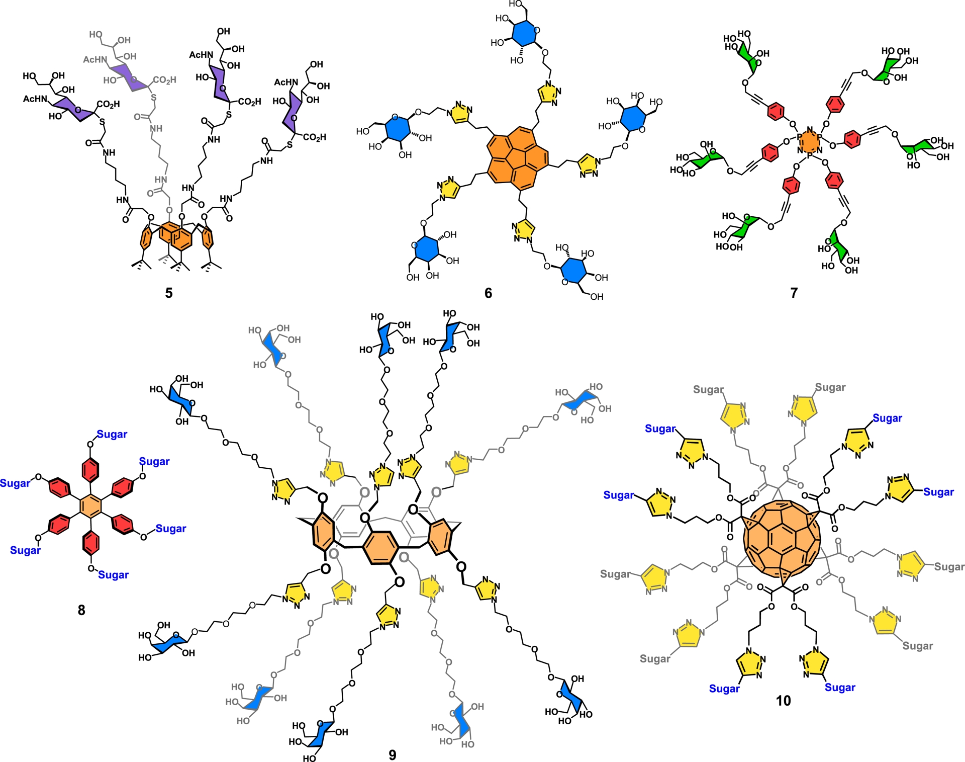 The Siegel group synthesized an interesting aromatic glycodendrimer based on corannulene, which harbored five β-D-galactopyranoside moieties (6) [80] (Figure 4). The pentakis bioconjugate was prepared using the increasingly successful copper catalyzed azide–alkyne cycloaddition reaction (CuAAC; click chemistry). Our own group was deeply involved in the design of a uropathogenic inhibitor based on Escherichia coli FimH infection [86]. Toward this goal, a wide range of α-D-mannopyranoside dendrimers were successfully produced, among which is hexakis mannoside 7 built on a cyclotriphosphazene core [44, 45, 66]. It is to be noted that the cyclotriphosphazene scaffold exposes three of its six appendages on top of the molecules while the other three are in the opposite downward directions [32, 44]. This geometry is in sharp contrast when hexaphenylbenzenes are used as the central building block. A glycodendrimer such as 8 constitutes a case where the carbohydrate residues are planarly exposed [83].
