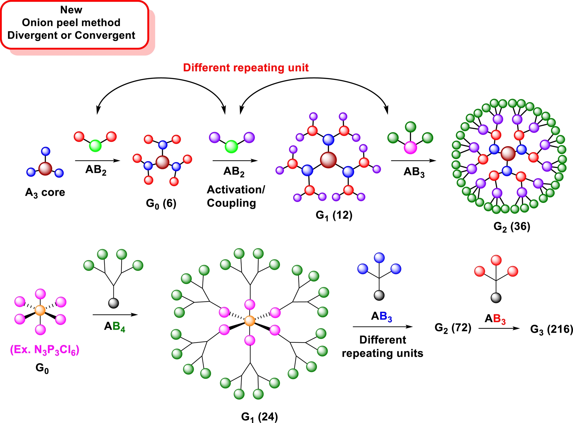 As opposed to conventional dendrimer syntheses that use low valency scaffolds and identical building blocks in repetitive sequences requiring a large number of steps to achieve high surface group densities, the onion-peel strategy starts with highly functionalized scaffolds such as that shown in Figure 2 and including dipentaerythritol 19 (Scheme 3). By using different building blocks at each layer, a much wider chemical space can be reached, thus enabling improved control over chemical, physical, and biochemical properties in addition to providing high surface group density in much fewer steps. Figure 5 presents the onion-peel strategy. Clearly, not only the methodology offers a wide range of chemical possibilities but also it offers a rapid build-up and reduced number of steps to create a higher number of surface groups.