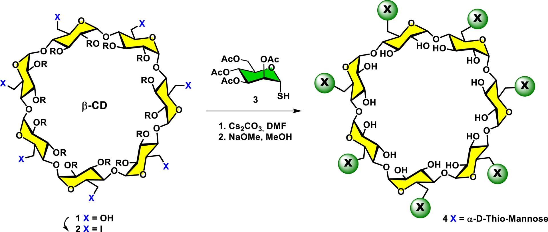 As a typical illustration of the high potential and efficiency in the use of multifunctional scaffolds [73], our team has used β-cyclodextrin [74, 75, 76]. Cyclodextrins constitute a family of cyclic oligosaccharides derived from starch by enzymatic treatment. There are three major structures of cyclodextrins (α, β, and γ) forming 6-, 7-, and 8-membered rings through (1-4)-α-D-glucopyranosidic linkages, respectively. For instance, using β-cyclodextrin as a scaffold (1), the hydroxy groups were transformed into peracetylated heptakis iodo β-cyclodextrin (2), which upon treatment with per-O-acetylated 1-thio-α-D-mannose (3) (Cs2CO3, DMF) followed by the removal of O-acetyl protecting groups produced glycodendrimer 4 in high yield (Scheme 1). The expedient synthesis of heptakis α-D-mannopyranosides provided potent glycoclusters capable of rapidly interacting with the homotetrameric leguminous lectin isolated from Canavalia ensiformis (Concanavalin A [ConA]) as demonstrated by their capacity to form stable insoluble cross-linked lattices. In this work, several related families of mannosylated β-cyclodextrin were similarly prepared, some of which had aromatic linkers while others had extended linking arms. The results further demonstrated the general usefulness of carbohydrate-containing aromatic aglycones in the binding of lectins. The use of cyclodextrins as multivalent scaffolds toward the construction of hyperbranched glycodendrimers has been comprehensively detailed in a seminal review by a Spanish group [77, 78].