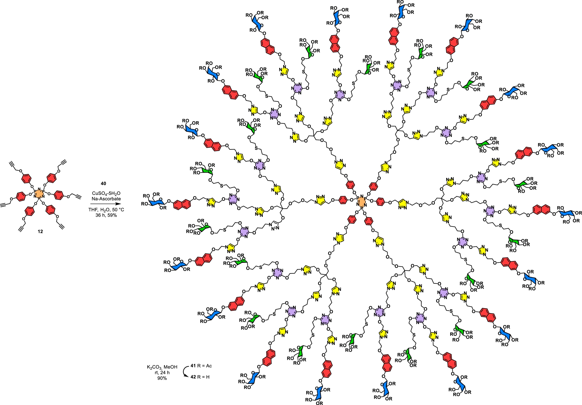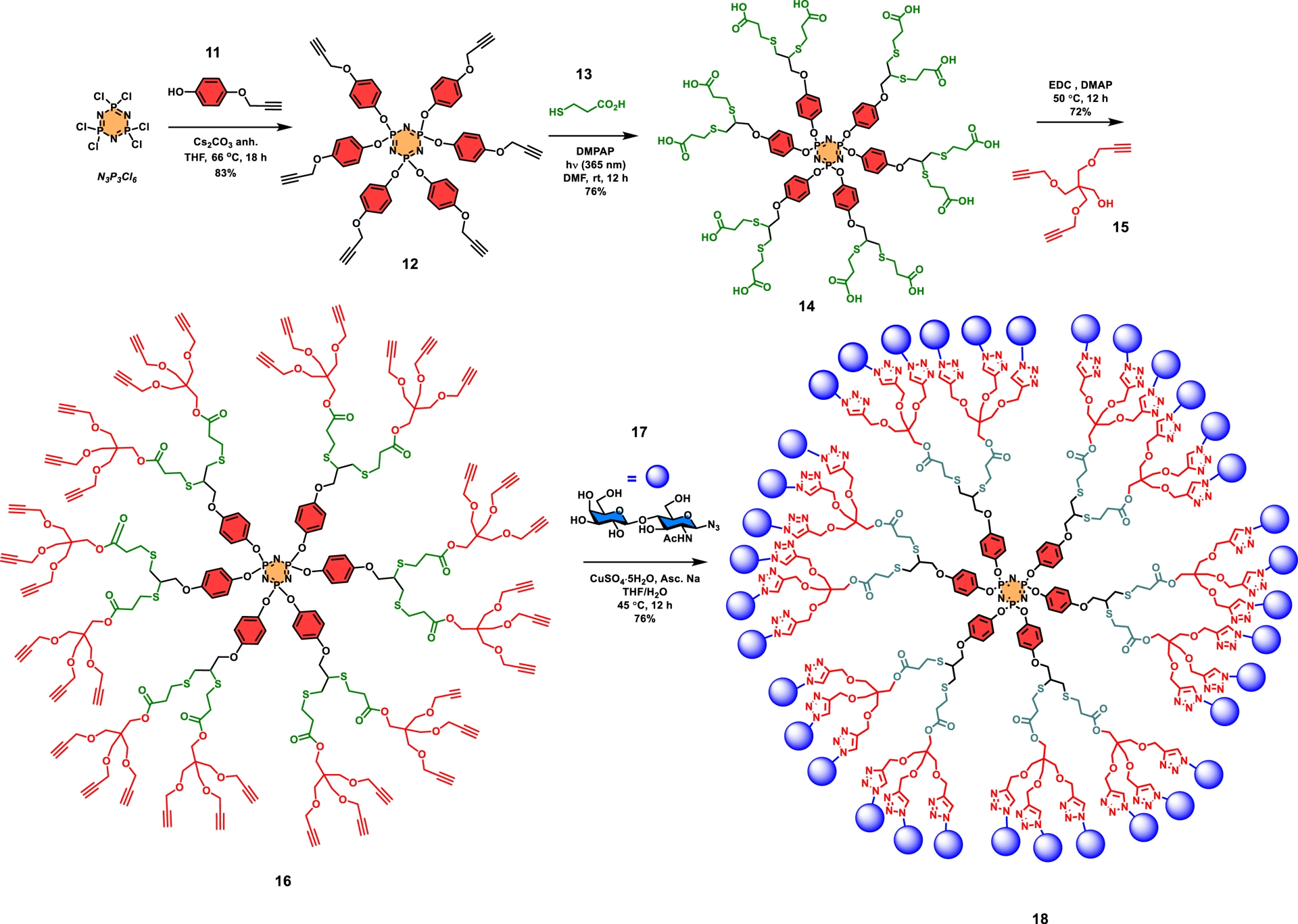 As an illustration of this approach, the synthesis of a glycodendrimer having 36 LacNAc disaccharides as surface groups was published (Scheme 2). For this purpose, a hexachlorocyclotriphosphazene (N3P3Cl6) core was initially chosen, which was treated with monopropargylated benzene-1,4-diol (hydroquinone) 11 (Cs2CO3, THF, 66 °C, 18 h) to provide the known hexapropargylated cyclotriphosphazene 12 as a crystalline adduct in 83% yield [32, 44, 93]. The next step involved a thiol–yne photocatalyzed addition of 3-mercaptopropanoic acid (13) to form dendrimer 14 having twelve carboxylic acids as surface groups in 76% yield. Trispropargylated pentaerythritol (15) serving as an AB3 wedge was subsequently anchored via carbodiimide-mediated esterification to achieve the construction of hypercore 16 in good yield (72%). This sequence of reactions corresponds to 6 × 2 × 3 (for 36 groups) illustrating an A6 core, followed by an equivalent AB2 interlayer, and finally an AB3 building block. The final step necessitated the use of a LacNAc azide (17), which upon CuAAC coupling produced targeted glycodendrimer 18 in 76% yield. The strategy allowed the use of an unprotected glycoside derivative. Spectroscopic analyses (NMR, MS) were all consistent with the anticipated structure. A low-resolution mass spectral value was obtained by the MALDI-TOF technique ([M+Na]+ adducts) for which compound 18 exhibited a molecular weight of m/z 19774.8 for a calculated value of m/z 19779.9.