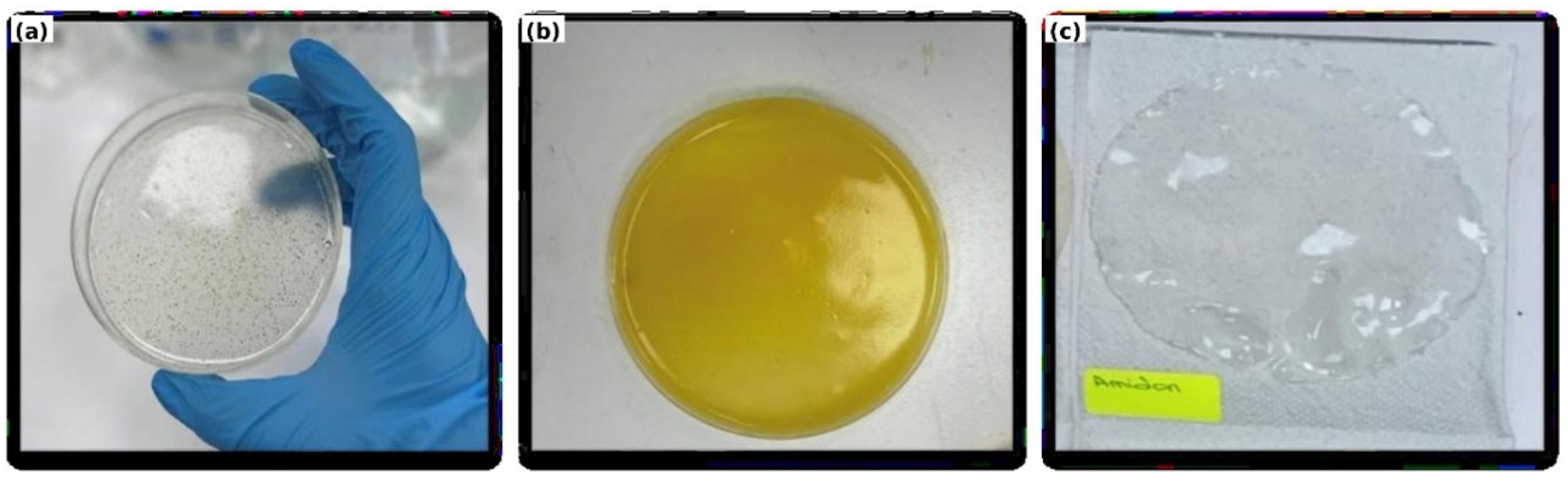 Aspect macroscopique des bioplastiques formulés : (a) film bioplastique à base d’amidon/nanocellulose ; (b) film bioplastique à base d’amidon/pectine ; (c) film bioplastique d’amidon.