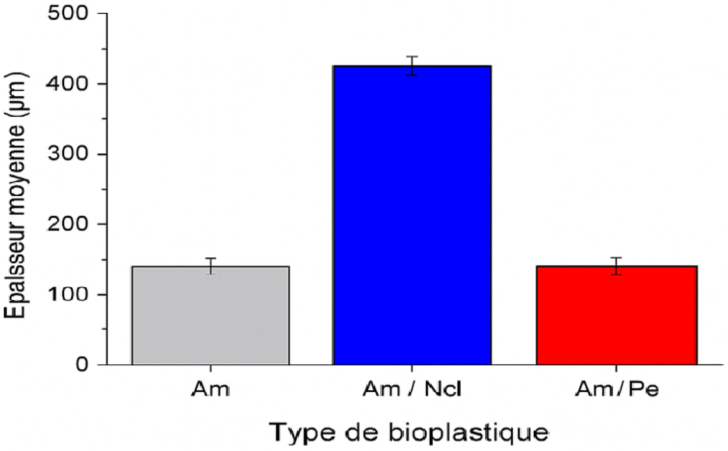 Comparaison de l’épaisseur des bioplastiques formulés (Am : amidon, Am/Ncl : amidon/nanocellulose, Am/Pe : amidon/pectine).