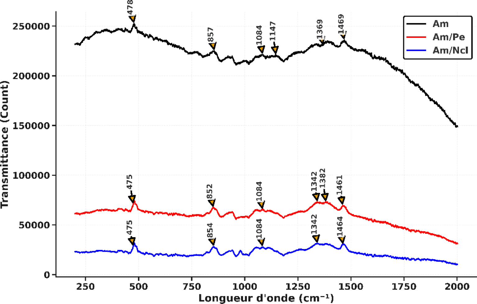 Les spectres Raman enregistrés pour les films bioplastiques à base d’amidon permettent d’identifier les modifications des interactions moléculaires induites par l’incorporation de biopolymères tels que la pectine (Am/Pe) et les nanocristaux de cellulose (Am/NCl). Les résultats correspondants sont présentés à la Figure 3. Ainsi, la comparaison des spectres Raman des films Am, Am/NCl et Am/Pe met en évidence des altérations structurales significatives au sein du réseau polymérique, résultant directement de l’intégration de ces renforts polysaccharidiques.
