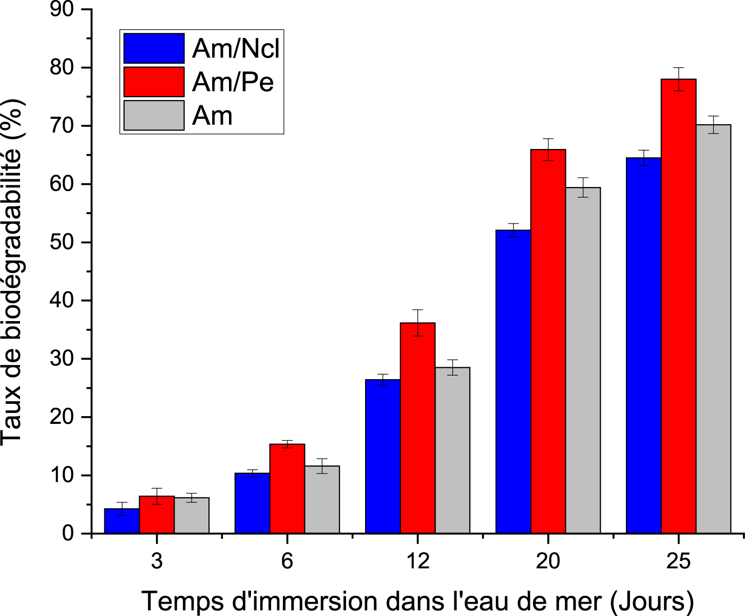 Les trois formulations montrent une dégradation progressive mais incomplète à 25 j, avec la hiérarchie Am/Pe (78 %) > Am (∼70 %) > Am/Ncl (∼64 %). La cinétique initiale est modérée, probablement liée à la période d’acclimatation microbienne et à la formation d’un biofilm avant l’accélération observée après 10 à 12 j, un comportement couramment rapporté pour les polymères biodégradables en milieu marin [54, 55]. Le taux plus élevé de dégradation observé pour le bioplastique amidon/pectine (Am/Pe) s’explique par la structure amorphe et hydrophile de la pectine, qui facilite l’imbibition d’eau et rend la matrice plus accessible aux enzymes hydrolytiques. Ce résultat est en accord avec les observations de Gómez-Aldapa et al., qui rapportent des pertes de masse supérieures à 90 % en 25 à 30 j pour des films à base d’amidon et de pectine exposés à des milieux aqueux [56]. À l’inverse, la nanocellulose, plus rigide et cristalline, confère une barrière structurale limitant la diffusion de l’eau et la dépolymérisation enzymatique, ce qui ralentit la dégradation [57]. Les valeurs globalement plus faibles qu’en sol s’expliquent par les conditions du milieu marin, notamment la salinité élevée, la température plus basse, et la densité microbienne réduite, qui limitent la biodégradation aérobie. Ces paramètres environnementaux sont déterminants dans la cinétique de dégradation et expliquent que les films amidonnés présentent généralement des taux compris entre 60 et 90 % après 20 à 30 j selon la composition et le milieu [58].