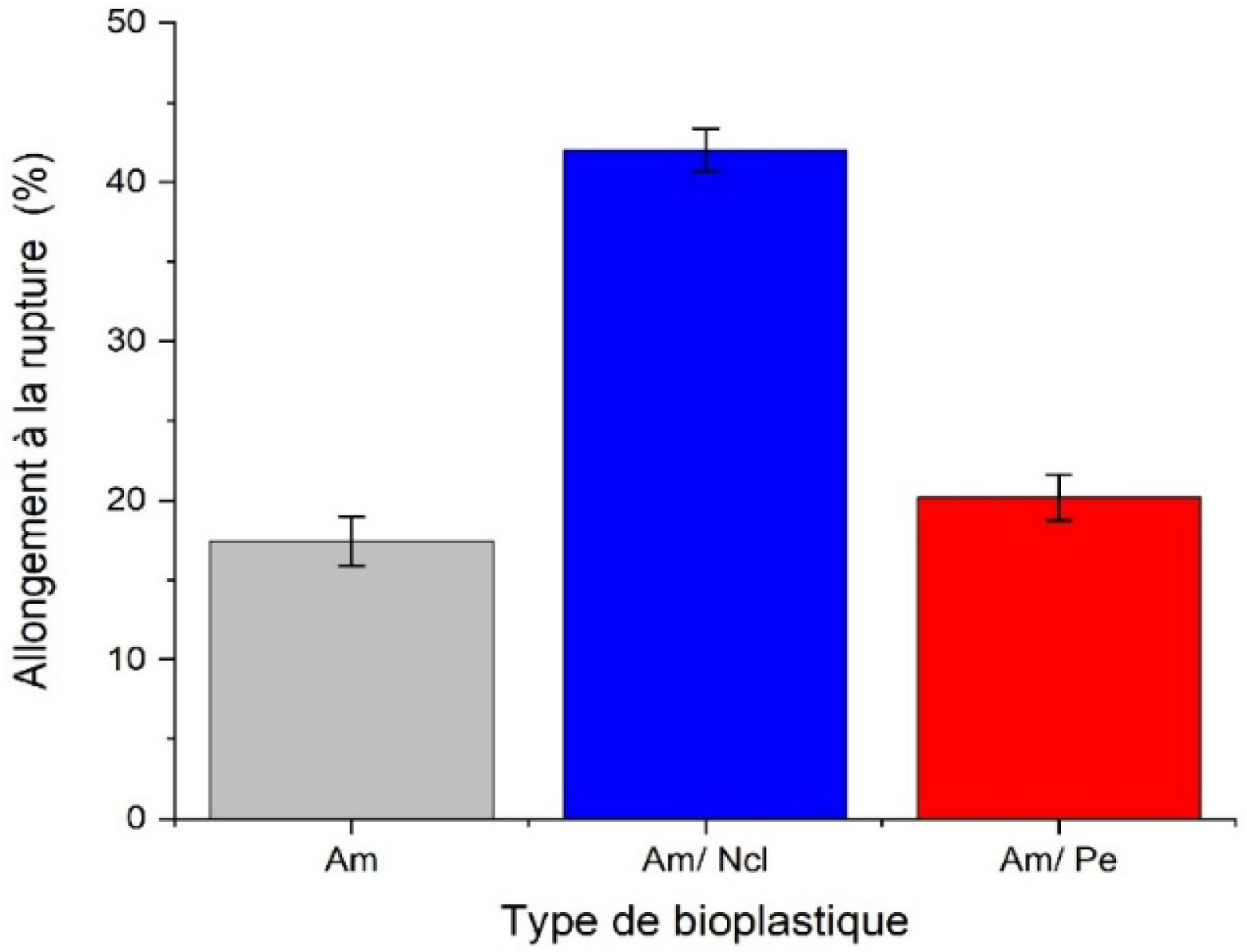 Globalement, en comparant nos bioplastiques aux plastiques biodégradables modernes utilisés dans l’industrie de l’emballage, tels que l’acide polylactique (PLA d’après l’anglais), on constate que la formulation Am/Ncl en particulier présente une résistance à la traction plus faible mais un allongement à la rupture légèrement supérieur. En effet, le PLA affiche typiquement une résistance à la traction d’environ 35 MPa et un allongement à la rupture voisin de 30 % [68].