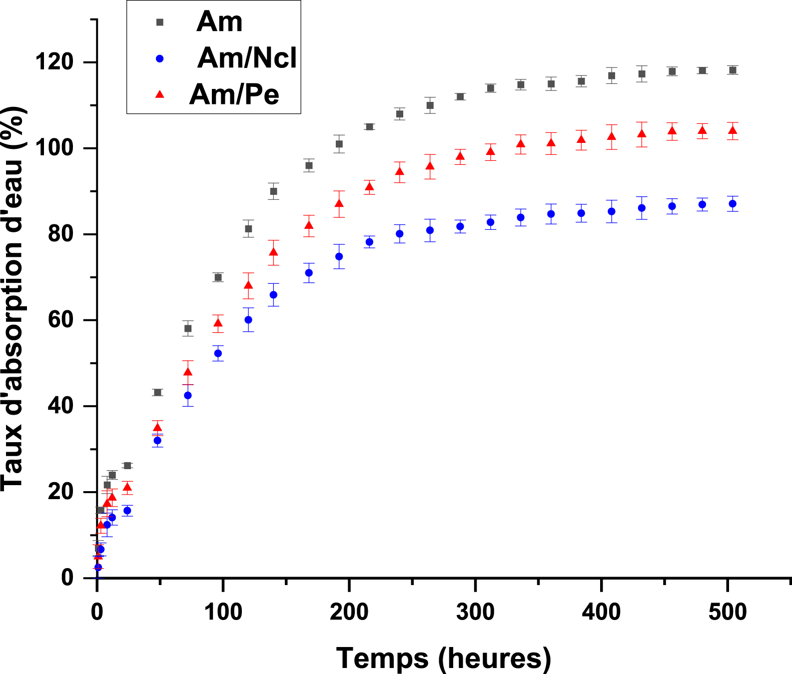 Cinétique d’absorption d’eau de diverses formulations bioplastiques.