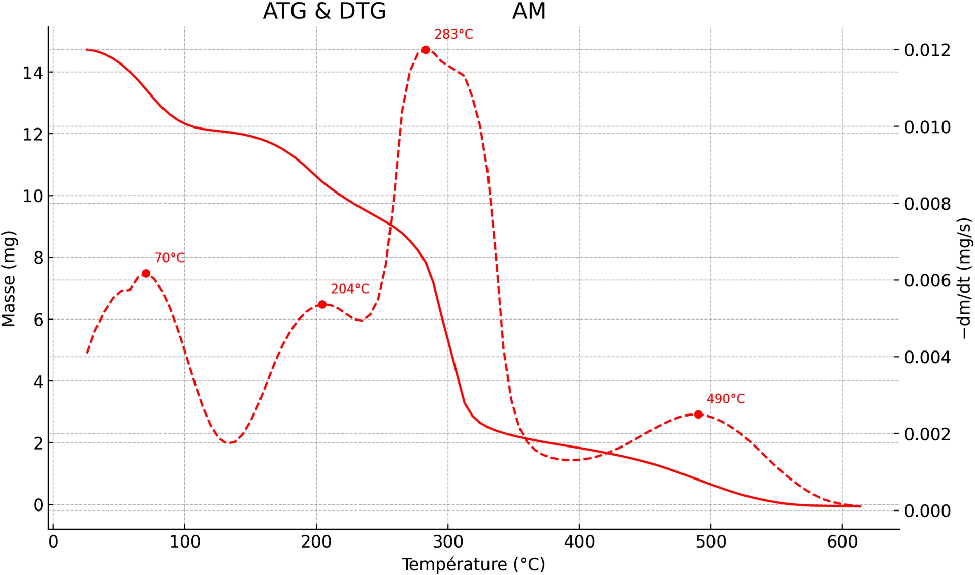 L’analyse thermogravimétrique (ATG) et l’analyse thermogravimétrique dérivée (DTG) du bioplastique à base d’amidon extrait d’épluchures de pommes de terre et plastifié à la glycérine (Figure 10) révèlent une dégradation en quatre étapes principales avec des maximums de perte de masse respectivement aux températures de 70, 204, 283 et 490 °C :