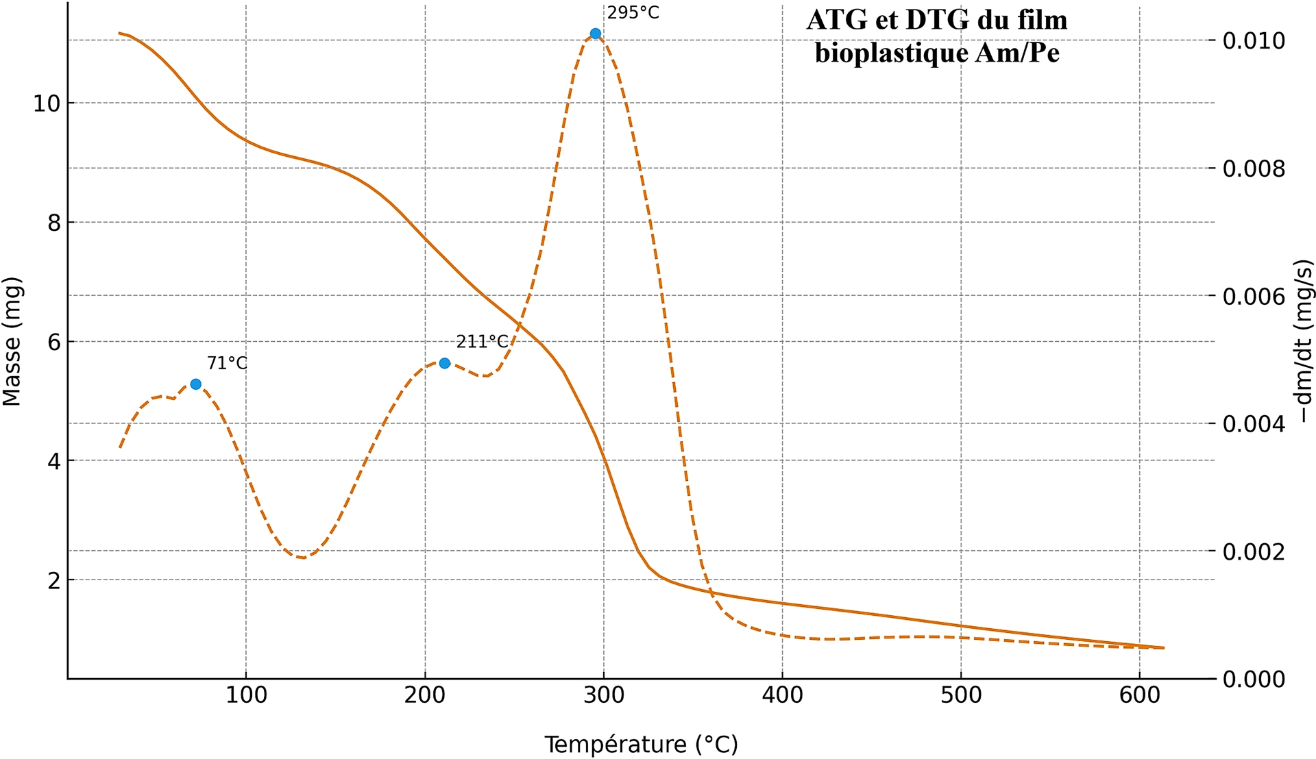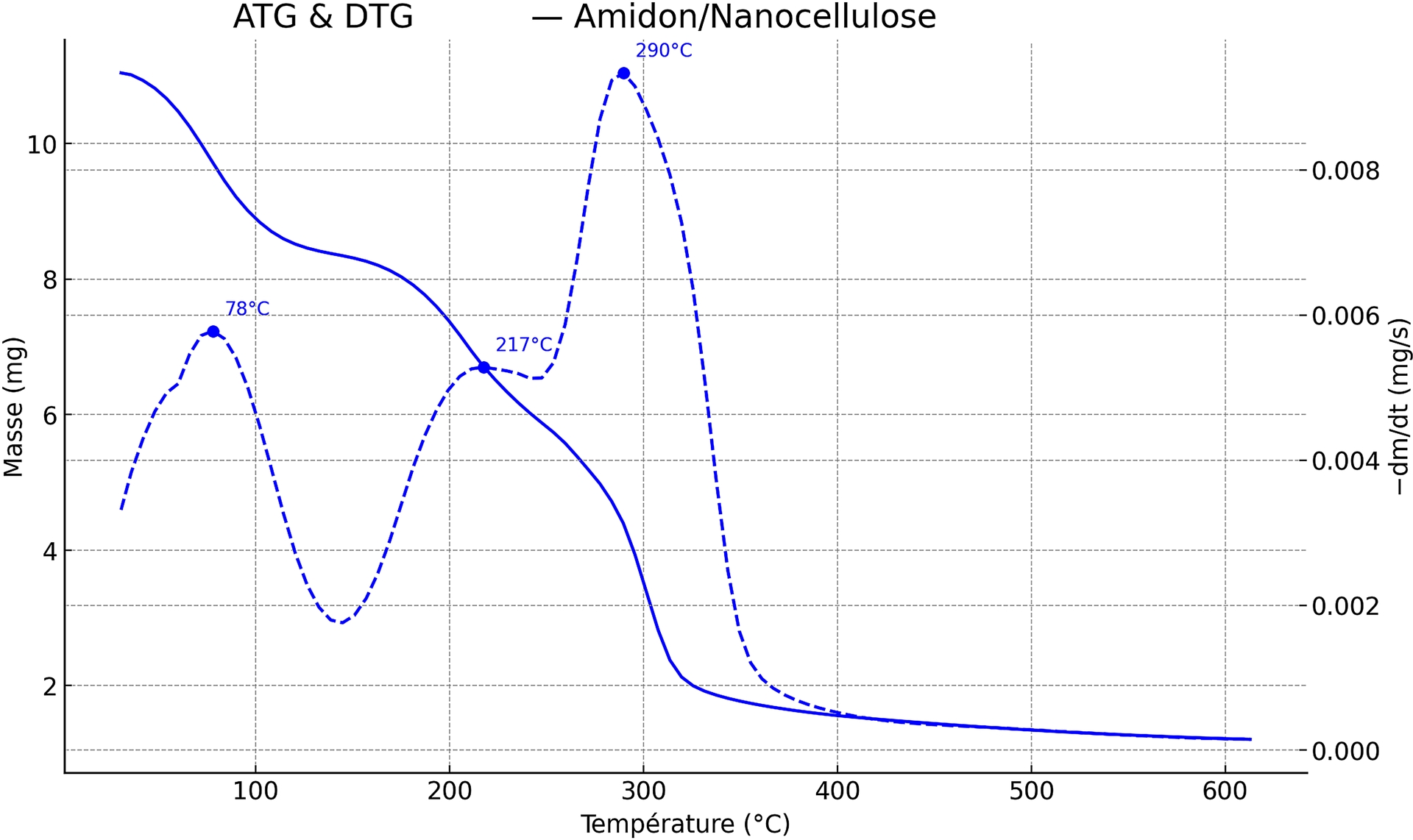 - Un palier de perte de masse 150–250 °C avec un maximum à 217 °C qui correspond au début de la déshydratation intramoléculaire et de la dépolymérisation de la matrice. Cette étape est compatible avec les signatures TGA typiques de l’amidon [74].