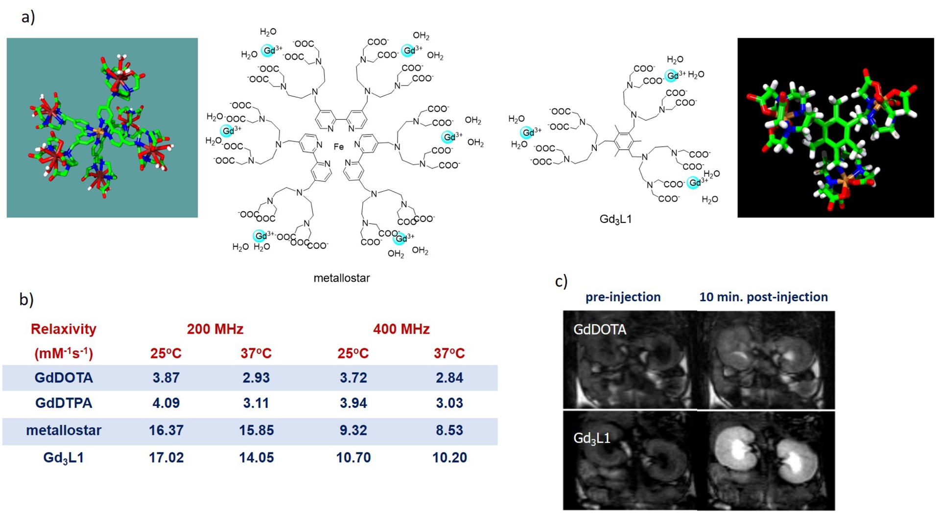 (a) Structure of the metallostar and of the Gd3L1 trimer having optimized relaxivity for high-field MRI applications. (b) Relaxivities at different frequencies and temperatures compared to the clinical agents GdDOTA and GdDTPA. (c) Dynamic contrast enhanced magnetic resonance images acquired at 9.4 T (400 MHz proton Larmor frequency) after GdDOTA or Gd3L1 injections at 8 mmol⋅Gd⋅kg−1 dose. For both complexes, marked signal intensity increase is observed in the vascular system, renal cortex, and medulla; the signal enhancement is considerably higher with Gd3L1 due to its threefold higher relaxivity (adapted with permission from Contrast Media Mol. Imag. [19]).